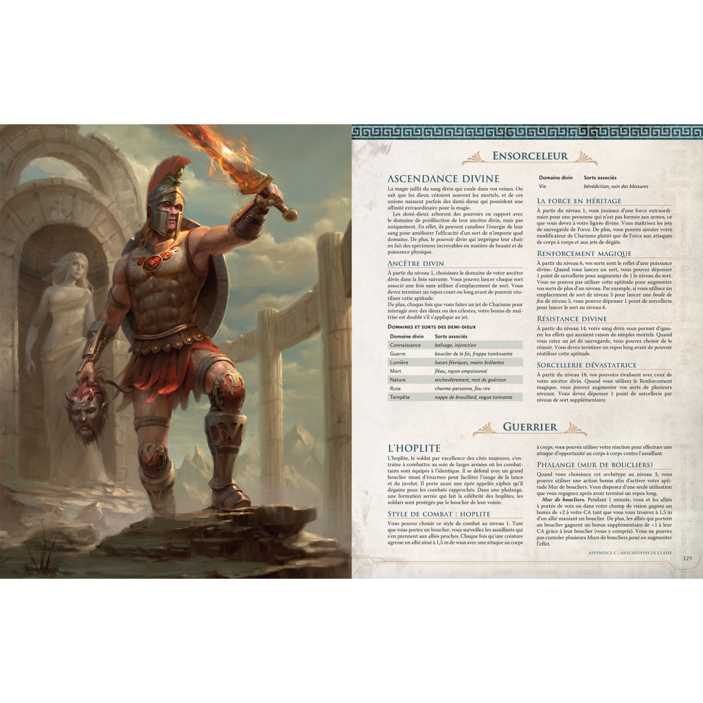 - De nouvelles races et Archétypes de classe: vous trouverez de nombreuses races jouables (satyre, centaure, méduse…) ainsi que des Archétypes de classe inspirés de la mythologie (hoplite, amazone, mage philosophe…).