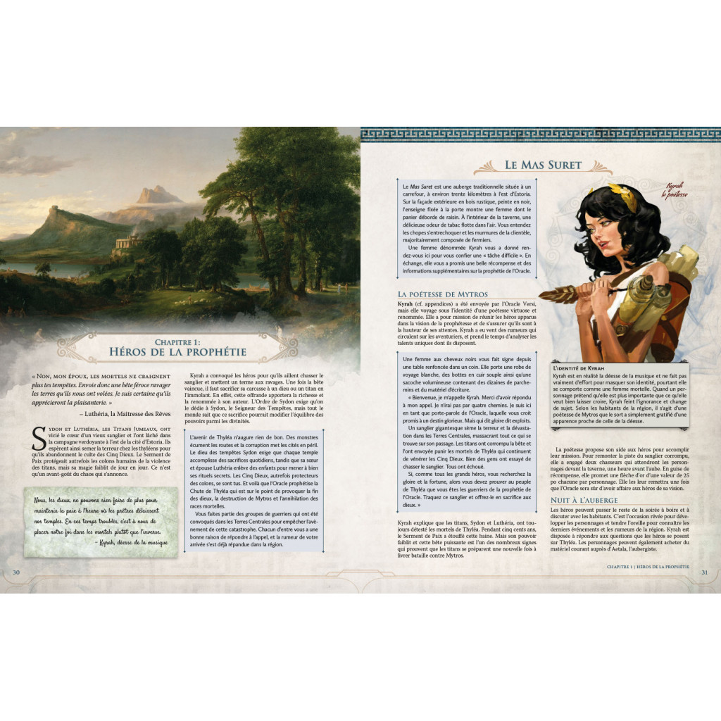 Quand cette campagne a été conçue, les auteurs ont pioché des idées dans différentes sources, que ce soit L’Odyssée, L’Iliade, Jason et les Argonautes, L’Orestie et bien d’autres œuvres. Toutefois, Thyléa n’est pas une copie parfaite de la Grèce antique. Vous ne retrouverez pas Zeus, Athéna ou Apollon dans le panthéon divin. En explorant Thyléa, vous croiserez des thèmes, des monstres et des trésors qui vous rappelleront la mythologie grecque, mais les règles qui régissent cet univers sont différentes. L’arrivée des mortels sur ce continent est très récente.