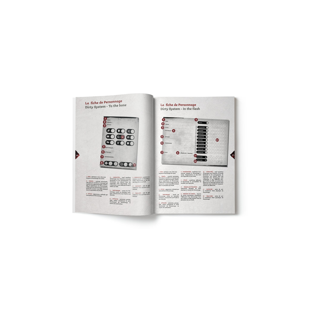 Dirty system – in the flesh : la version enrichie du Dirty System, offre plus d’options, incluant une gestion de réserves basée sur les enjeux de l’histoire, la collaboration et le roleplay, un système de conflit souple et versatile et de nombreux exemples pour vous approprier les mécaniques de jeu en une lecture.