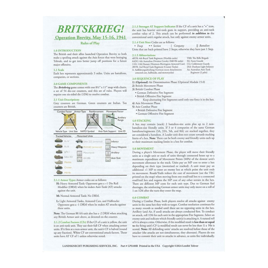 Ce jeu pour deux joueurs comprend une carte de 21,6 cm × 27,9 cm avec ses tableaux, un ensemble de 54 pions prédécoupés, ainsi que les règles. Rapide à jouer tout en restant précis dans le détail, Britskrieg! permet aux joueurs d’explorer comment chaque camp peut gagner — ou perdre — la maîtrise du champ de bataille.