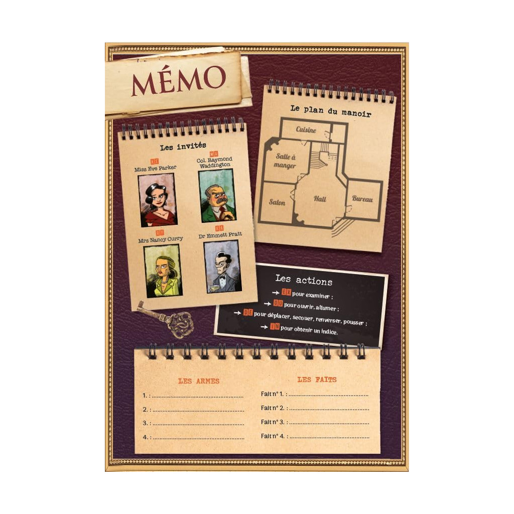 - 1 memo pour garder en tête le plan du manoir, les suspects, les actions possibles, etc.