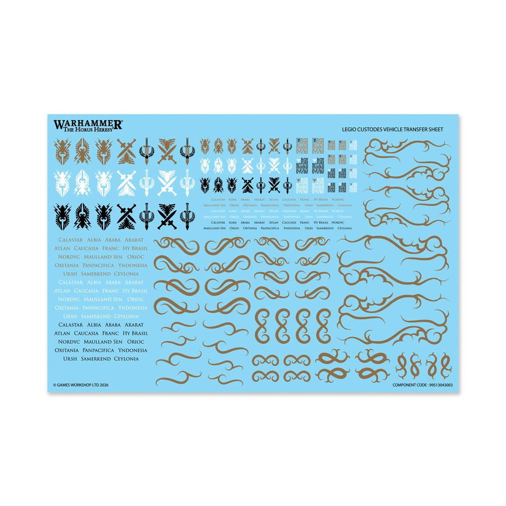 La Planche de Décalcos de Véhicule de la Legio Custodes propose 210 décalcos de grande qualité, dont des symboles des Custodiens, des textes rappelant vos glorieuses batailles et plus encore pour décorer votre figurine.