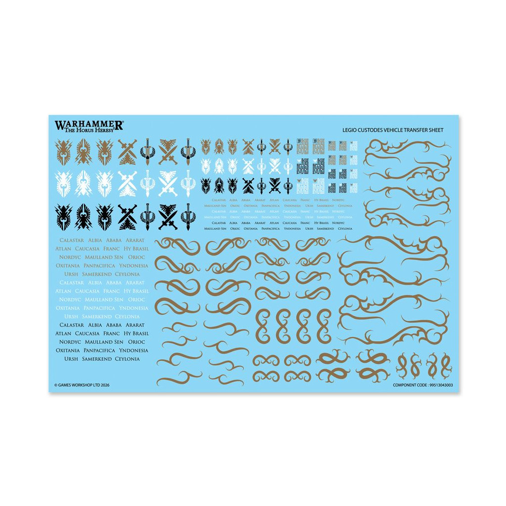 La Planche de Décalcos de Véhicule de la Legio Custodes propose 210 décalcos de grande qualité, dont des symboles des Custodiens, des textes rappelant vos glorieuses batailles et plus encore pour décorer votre figurine.