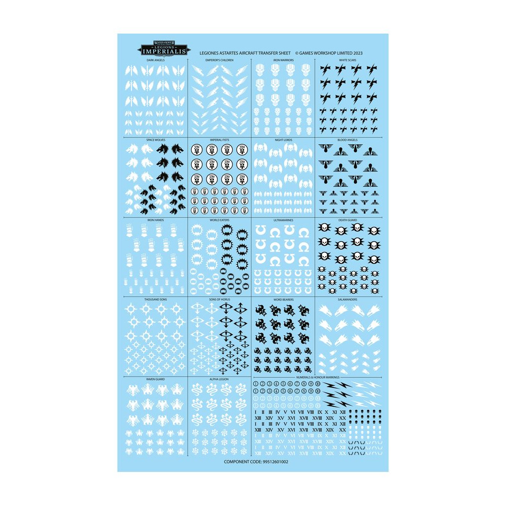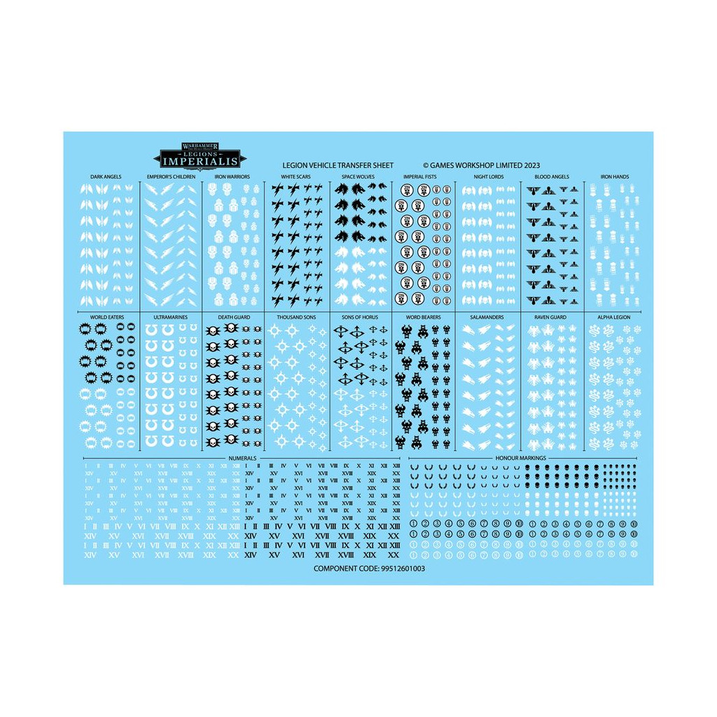Ce kit s'accompagne de 4x Planches de Décalcos des Véhicules des Légions, comprenant chacune 1130x décalcos de grande qualité, et de 1x Planche de Décalcos des Appareils Volants des Legiones Astartes, comprenant 748 décalcos de grande qualité, afin de décorer vos figurines. Il s'y trouve des icônes pour chacune des 18 Légions de l'Hérésie d'Horus, ainsi que des chiffres et des symboles honorifiques.