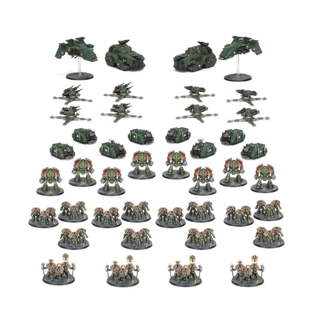 Cette boîte bien remplie est idéale pour débuter une nouvelle collection ou pour étendre votre armée existante des Legiones Astartes avant de la déchaîner dans les parties de Legions Imperialis, et vous ferez des économies par rapport à l'achat des kits au détail. Cette force est bâtie autour d'un noyau de Saturnine Terminators, de l'infanterie lourde d'élite, capable d'encaisser des quantités massives de tirs antipersonnel et d'infliger assez de dégâts pour boxer bien au-dessus de sa catégorie. Avec le soutien de Saturnine Dreadnoughts, d'artillerie, de chars, de transports et d'engins aériens, cela devient une armée polyvalente qui vous vaudra de belles victoires dans cette guerre civile accablante.