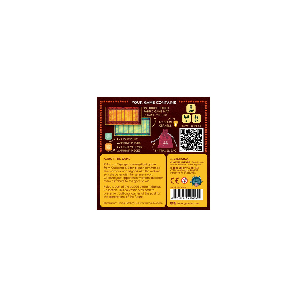 Puluc est un jeu de poursuite à 2 joueurs venant du Guatemala. Chaque joueur contrôle 5 guerriers. But du jeu : capturer tous les guerriers adverses et les offrir comme offrandes aux dieux pour sortir victorieux.