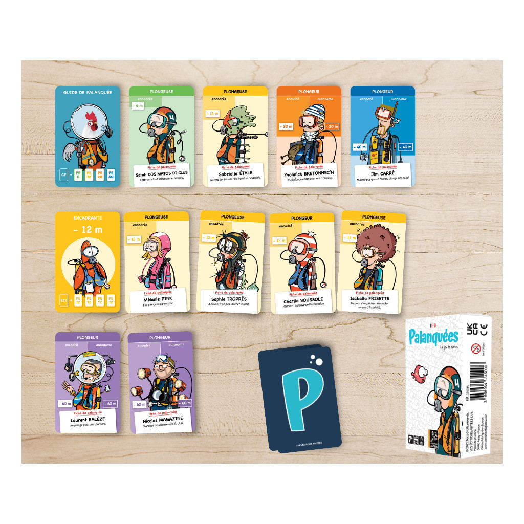 Chaque joueur tente de composer des combinaisons valides en posant des cartes représentant des plongeurs encadrés (PE), autonomes (PA), des encadrants (E) ou des guides de palanquée (GP). Le but ? Former des palanquées cohérentes selon les niveaux de profondeur… avant les autres ! Les cartes ACTION viennent semer le désordre en volant des cartes ou en forçant des échanges.