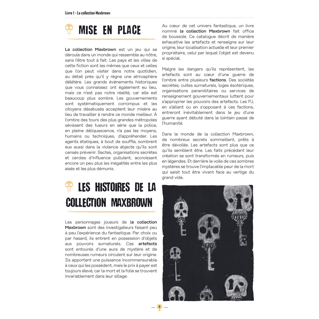 Ce jeu offre tous les outils pour jouer une histoire fantastique dans laquelle les héros voyagent aux quatre coins du globe pour chasser et étudier les Artefacts. Ces objets maudits par l’âme de puissants immortels sont réunis dans un ouvrage recherché par tous : la collection Maxbrown.
