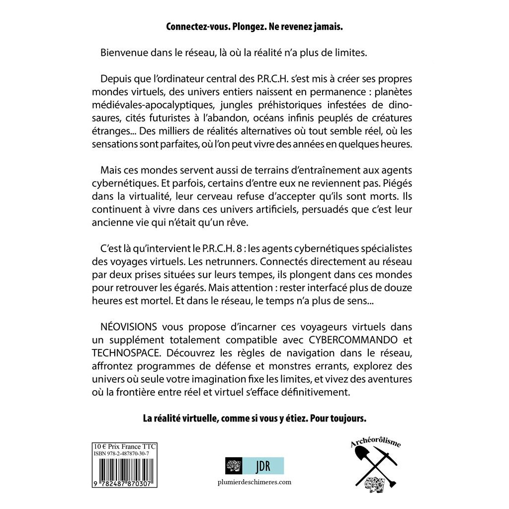 Néovisions vous propose d’incarner ces voyageurs virtuels dans un supplément totalement compatible avec CYBERCOMMANDO et TECHNOSPACE. Découvrez les règles de navigation dans le réseau, affrontez programmes de défense et monstres errants, explorez des univers où seule votre imagination fixe les limites, et vivez des aventures où la frontière entre réel et virtuel s’efface définitivement.