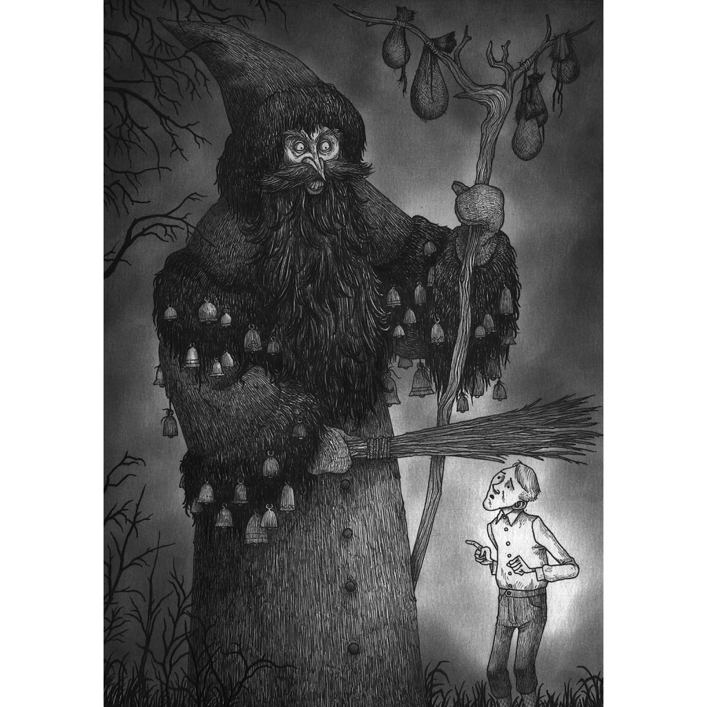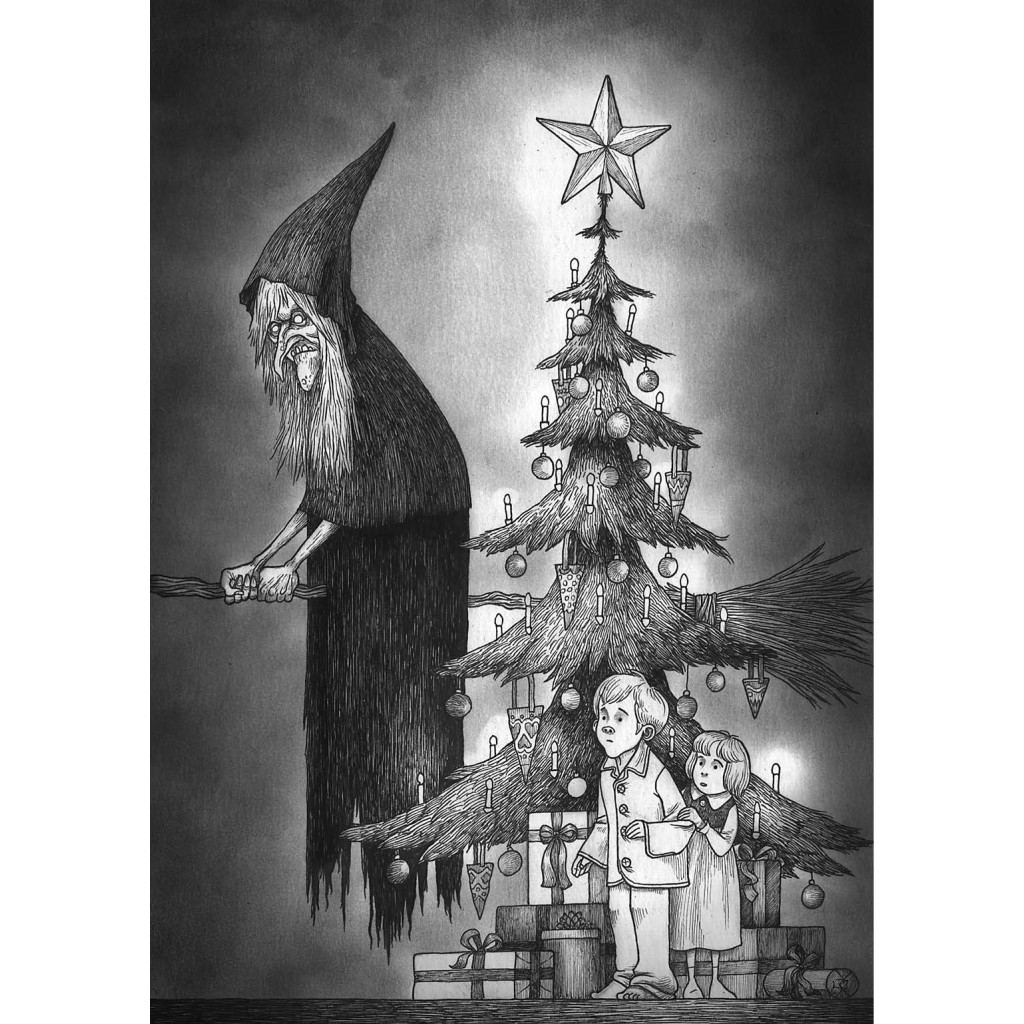 Ce bestiaire illustré présente 24 créatures légendaires issues des traditions populaires du monde entier – avec une forte présence du Nord et de l’Est de l’Europe. On y retrouve les incontournables comme le Krampus, cet alter ego démoniaque de Saint-Nicolas, mais aussi Grýla, la terrifiante ogresse islandaise qui dévore les enfants désobéissants, le Chat de Noël, qui traque ceux qui n’ont pas reçu de vêtements neufs, Baba Yaga, la sorcière des bois à la maison perchée sur des pattes de poulet, ou encore le Père Fouettard, figure sinistre du folklore français.