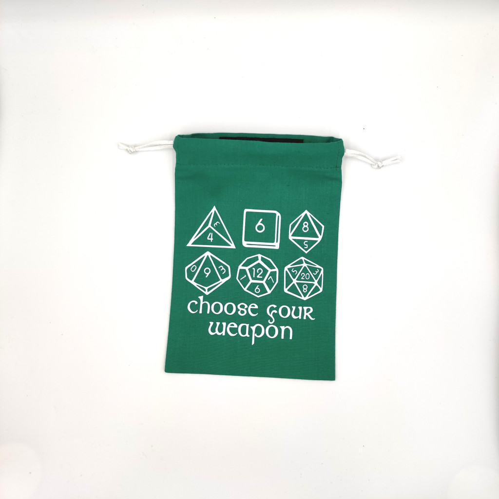 Ce sac pochon réalisé en coton uni permet de ranger des dés ou des petites pièces de jeux, il remplace avec élégance le sachet plastique, peu écologique. Il est orné d'un motif avec différents type de dés (D4, D6, D8, D10, D12 et D20) et le texte "choose your weapon" en flex thermocollant blanc.