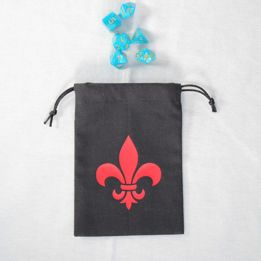 Cette bourse à dés plate en coton est ornée d'un logo fleur de lys qui représente l'emblème des Sœurs de Bataille. Elle permet de ranger et de transporter une centaine de dés.