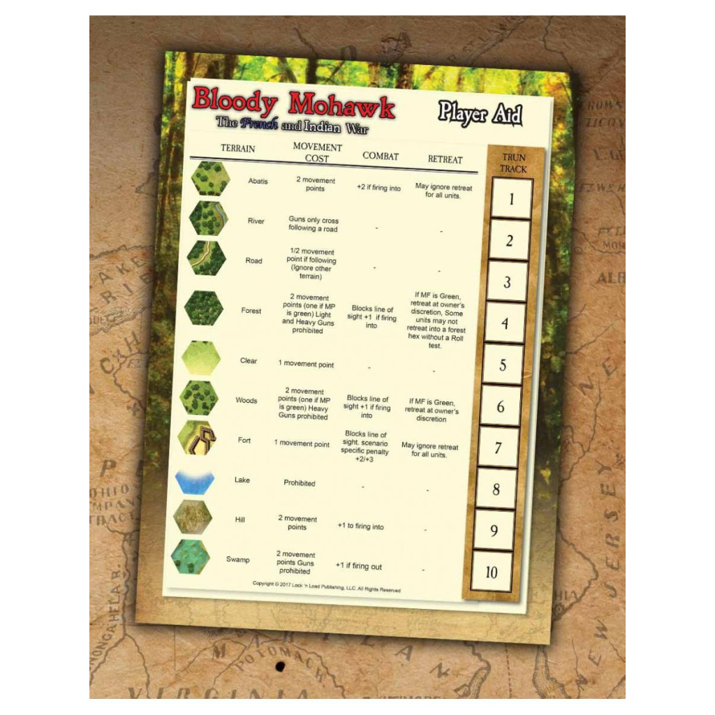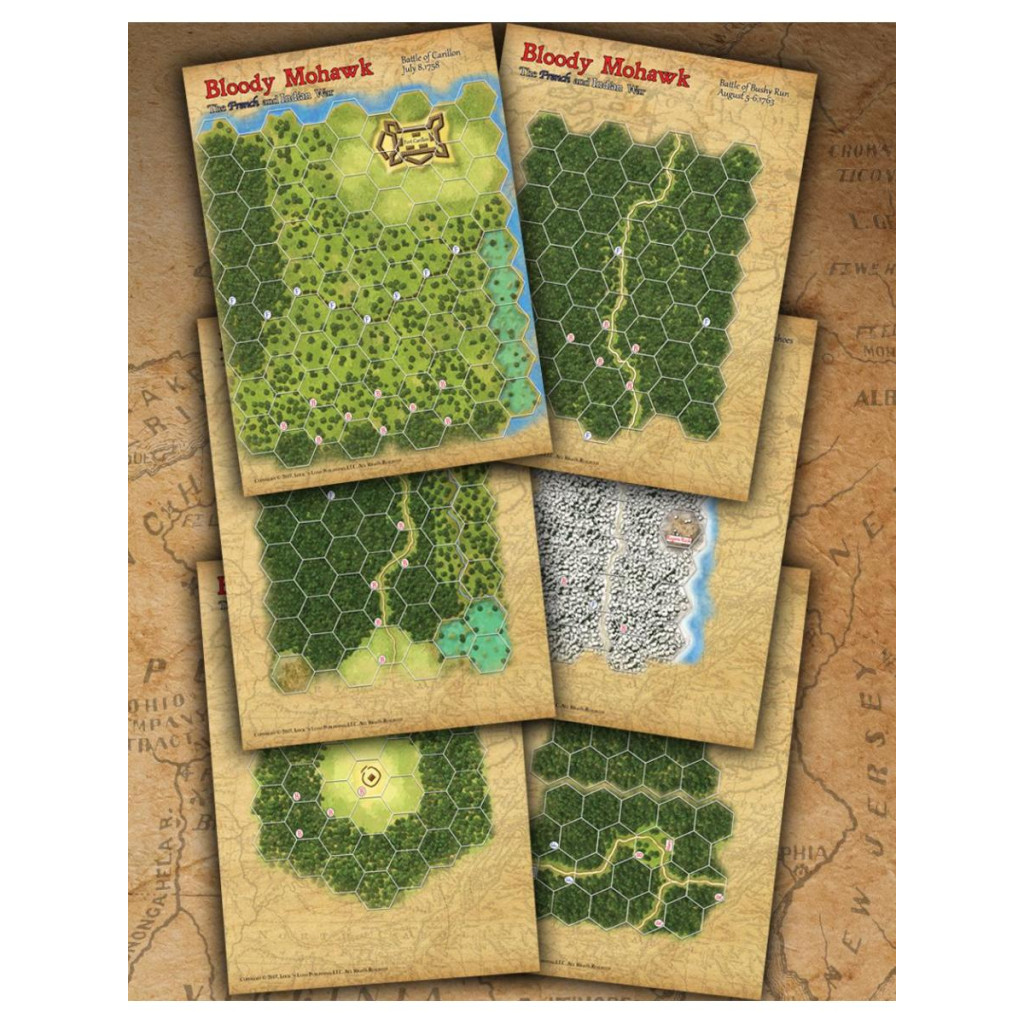 Bloody Mohawk, conçu par Bill Molyneaux, est une simulation de la guerre de la Conquête, également appelée guerre de Sept Ans. Les Anglais et les Français s'étaient affrontés pendant des années pour la possession de l'Amérique du Nord. Les deux camps souhaitaient contrôler deux rivières stratégiques, l'Allegheny et la Monongahela, qui représentaient des routes commerciales cruciales.