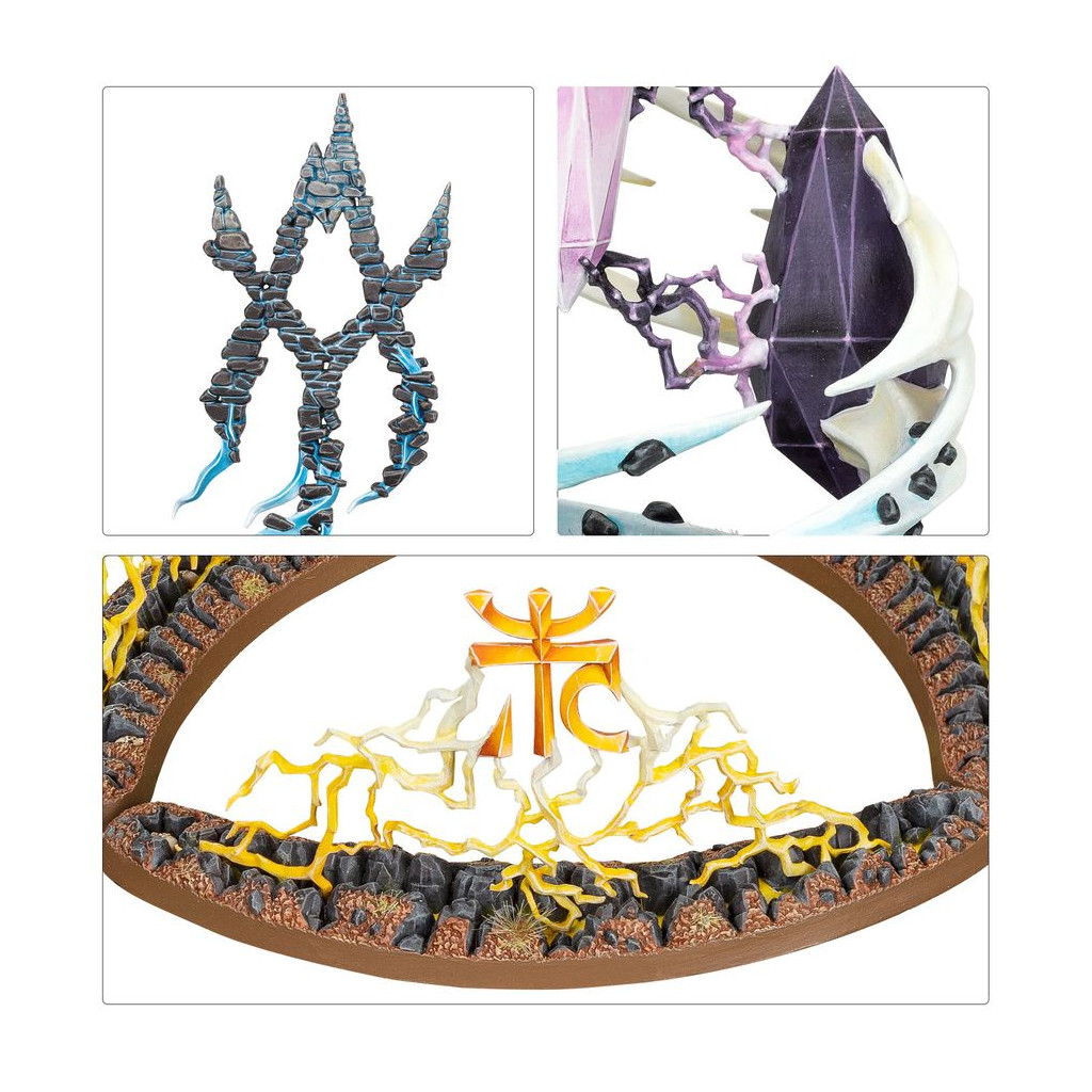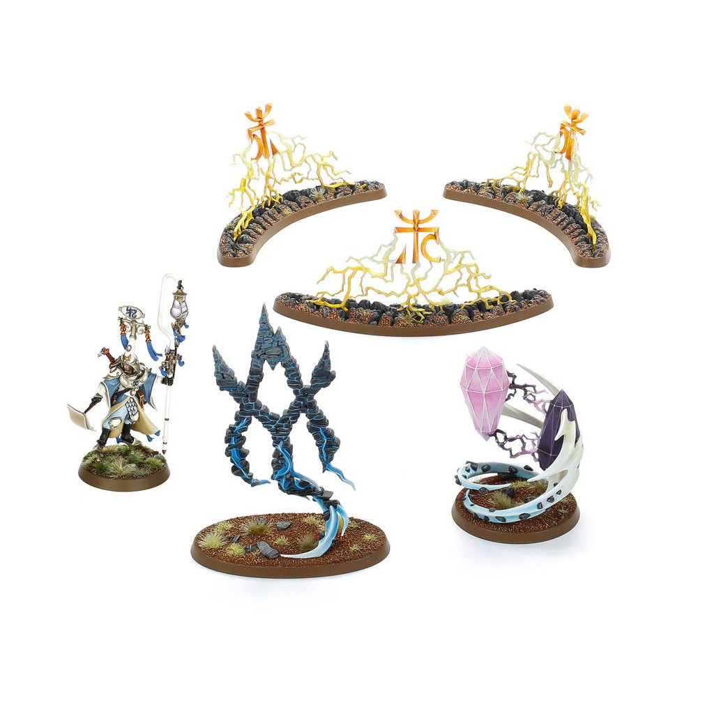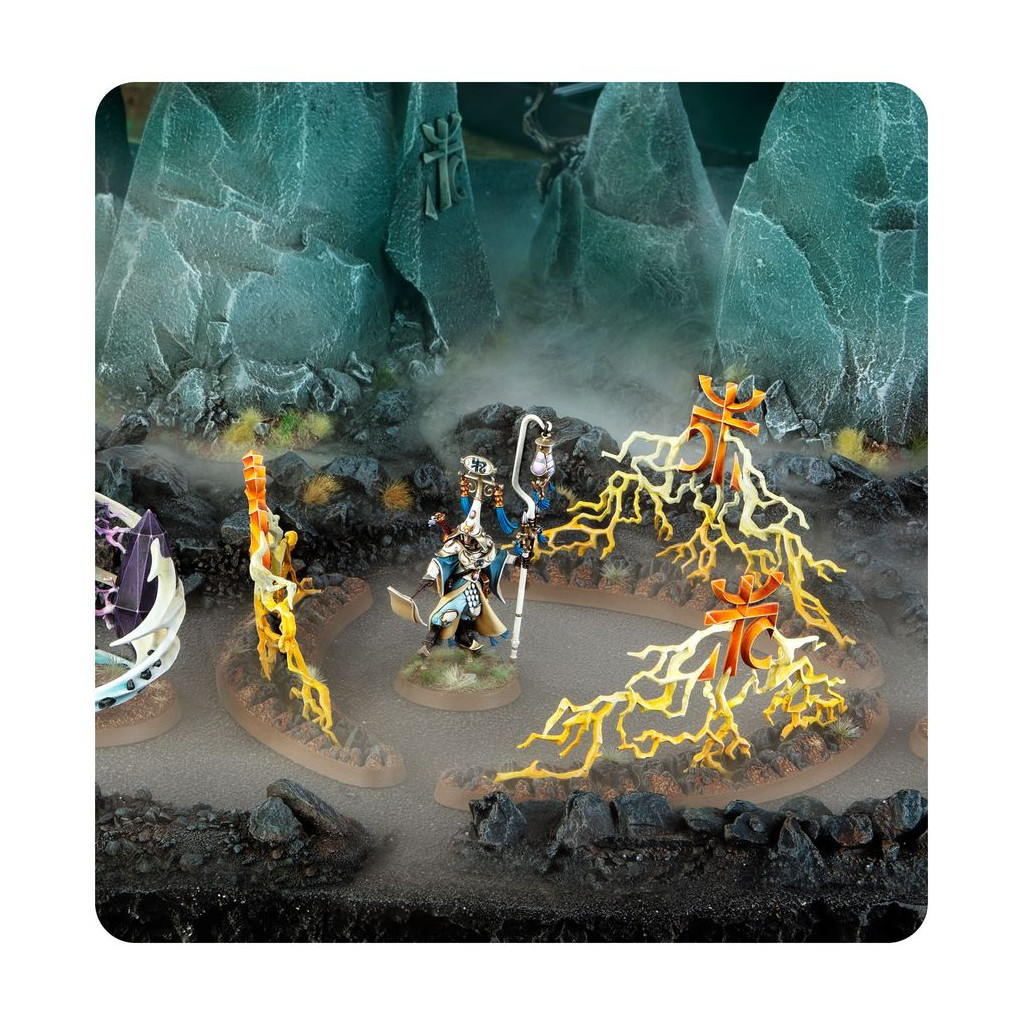 Ce kit en plastique permet d'assembler une Convocation des Sceaux, un Régiment de Renom pour vos armées des Cités de Sigmar, de Filles de Khaine, de Pyrotueurs, d'Abyssaux Idoneths, de Magnats Kharadrons, de Séraphons, d'Éternels de l'Orage et de Sylvaneths dans les parties de Warhammer Age of Sigmar. Les différentes unités qui la composent peuvent également être employées dans votre armée de Suzerains Lumineths. Ce kit vous permettra de faire des économies par rapport à un achat des kits au détail. Il contient un Calligrave Scinari, ainsi qu'un set de Sorts Persistants: un Sanctuaire d'Amyntok, des Pierres Jumelles de Hysh et une Rune de Pétrification. Ajoutez une puissante magie à vos armées pour les renforcer.