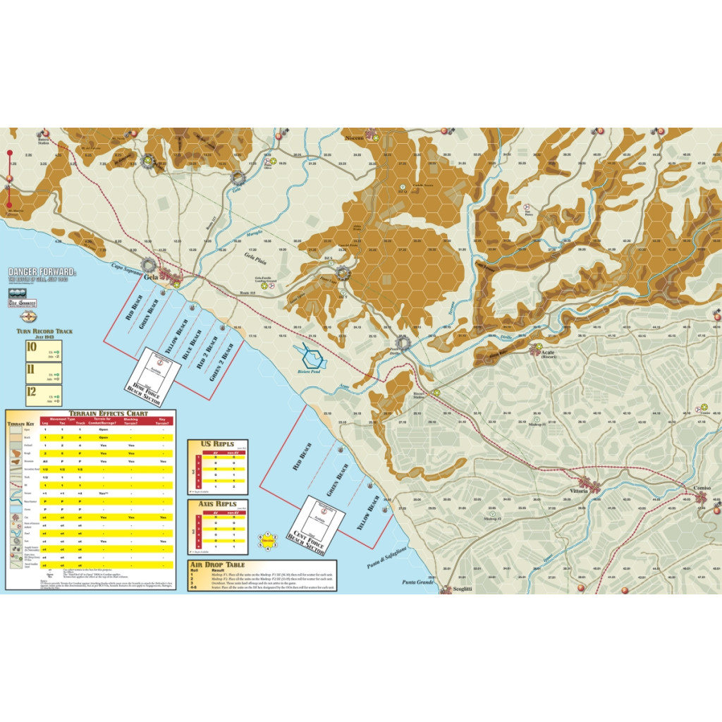 Danger Forward est un jeu complet couvrant la bataille de Gela qui s'est déroulée entre le 10 et le 12 juillet 1943 en Sicile. Suite aux débarquements initiaux de l'opération Husky, les Italiens et les Allemands étaient déterminés à rejeter les forces américaines à la mer. Ils lancèrent une attaque vigoureuse qui faillit réussir, bombardant les plages avec des tirs de chars. Les forces terrestres américaines, soutenues par la Royal Navy et l'US Navy au large, combattirent avec acharnement pour éviter la défaite. Ne se reposant pas sur leurs lauriers, les forces alliées durent progresser à l'intérieur des terres pour sécuriser des ports et des aérodromes afin de prendre l'île. La prise rapide de la Sicile mena à l'invasion de l'Italie et finalement à la chute de Mussolini. Tout cela se jouait en fonction de l'issue des combats à Gela.