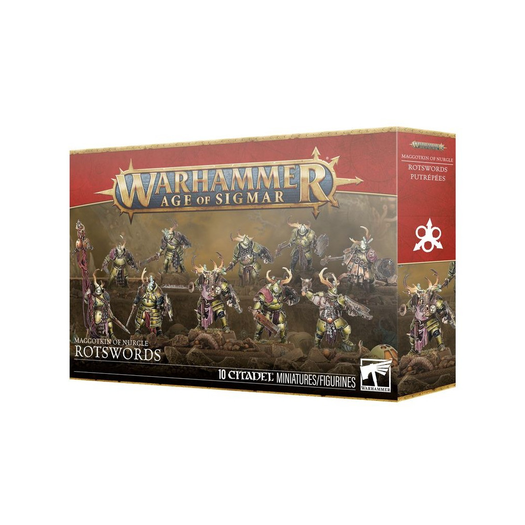 Ce kit en plastique permet d'assembler 10 Putrépées, des fantassins mortels et lourdement protégés pour vos armées de Putrescents de Nurgle dans les parties de Warhammer Age of Sigmar. Engoncés sous de lourdes plaques de métal rouillé, ils sont très difficiles à abattre et sont ainsi particulièrement efficaces pour tenir les objectifs. Chaque Putrépée peut être équipé d'une paire d'armes de corps à corps mortelles et souillées, ou d'une arme et d'un bouclier. Les armes de main droite et les boucliers de main gauche sont interchangeables entre les figurines, tout comme les 12 têtes que contient le kit, ce qui permet de personnaliser facilement votre unité. Vous y trouverez également les éléments nécessaires pour assembler un champion, un musicien et un porte-étendard optionnels, avec un choix de deux sommets de bannière.