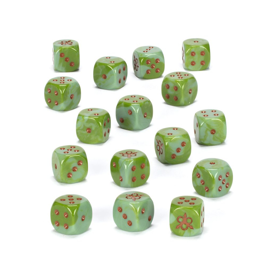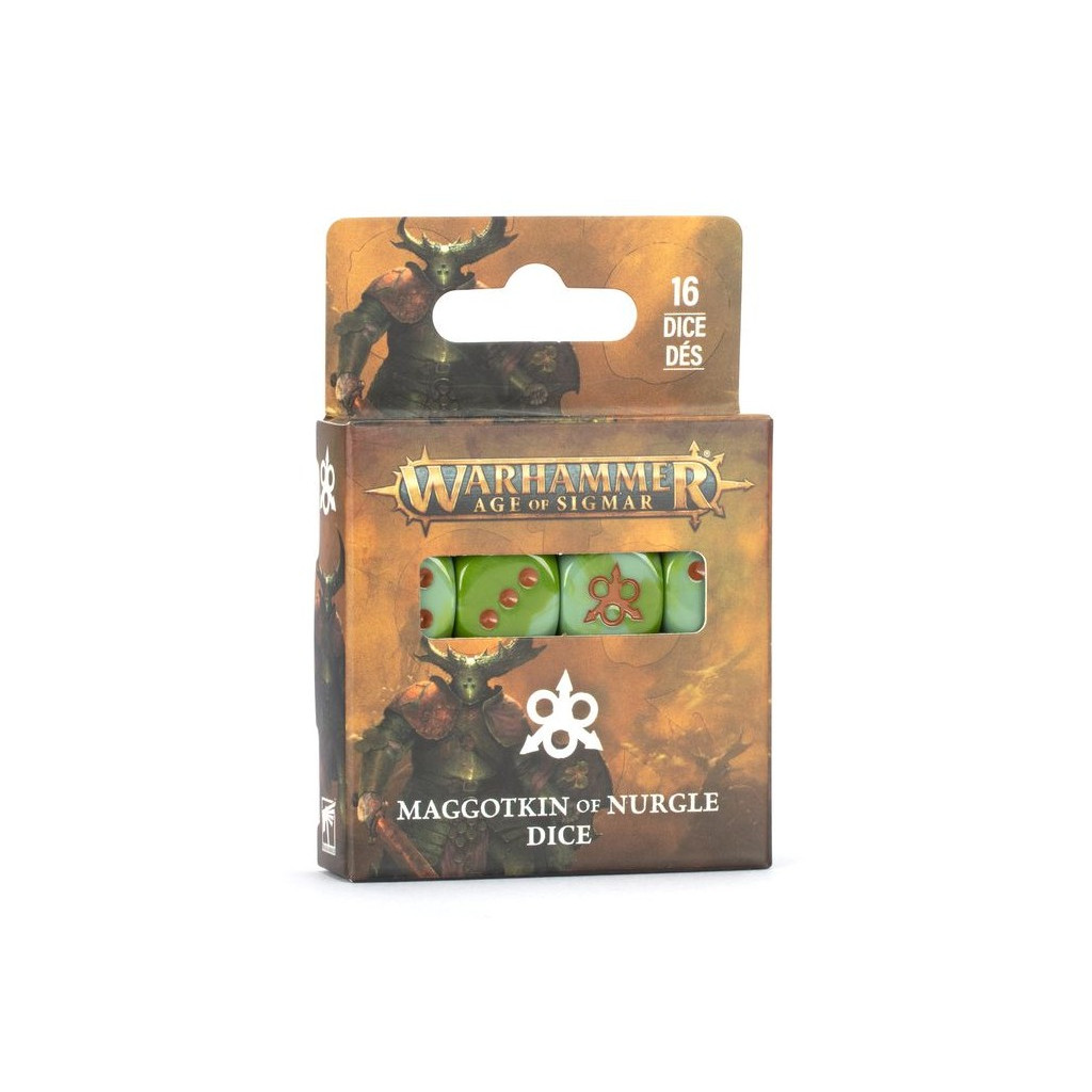 Ce set contient 16 dés à six faces aux arêtes douces pour les parties de Warhammer Age of Sigmar, sur le thème des Putrescents de Nurgle. Ils sont moulés en plastique acrylique vert pâle à volutes, avec des marquages marron et mesurent 16mm de côté. Les faces 1 à 5 sont numérotées avec des points traditionnels, tandis que la face du 6 arbore l'icône bubonique des Putrescents de Nurgle.