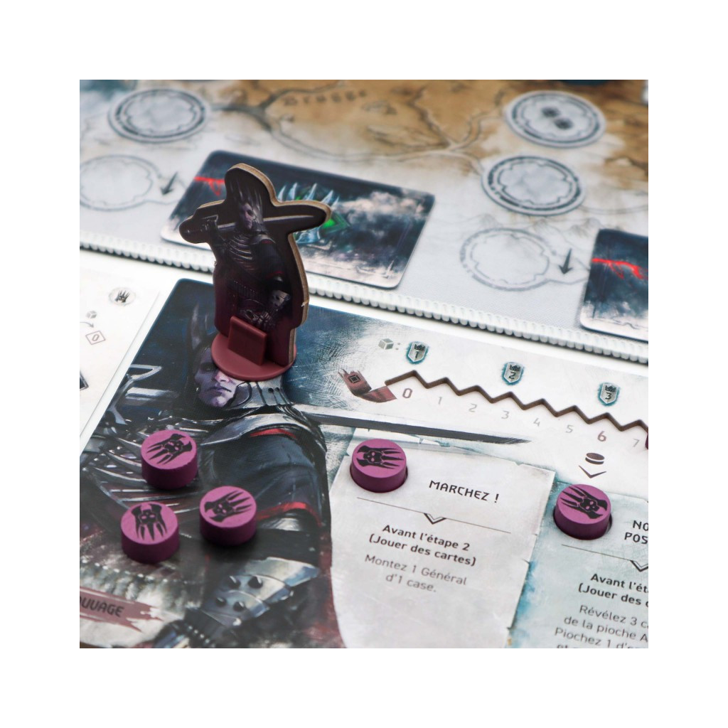 Cette extension comprend également un tapis de jeu ainsi que 4 figurines de Généraux — Eredin, Nithral, Caranthir et Imlerith ! Chacun de ces Généraux est assigné à l'une des quatre couleurs de cartes. Après avoir joué les couleurs correspondantes, la Chasse Sauvage fait avancer les Généraux sur la piste. Ce faisant, elle gagne de l'expérience et des points de victoire, mais surtout, elle accède à des cartes de Capacité spéciales de Généraux, grâce auxquelles elle peut entraver le jeu de ses adversaires.
