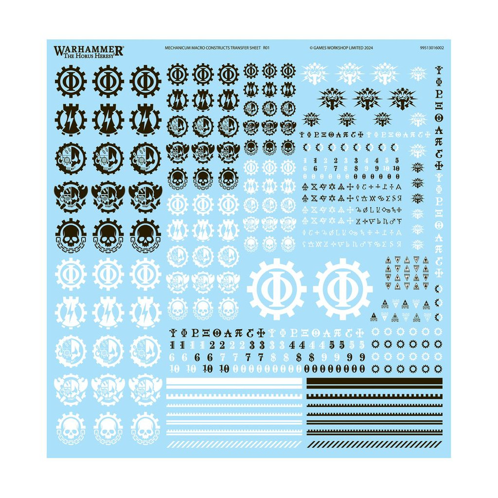 Ce kit est fourni avec 1x Planche de Décalcos de Constructions du Mechanicum comprenant 558 décalcos de grande qualité. Cela inclut des symboles pour l'Opus Machina, l'Opus Taghmata, le Lungum Cybernetica, le Cénacle Cybernetica et le Fracta Aedificium, ainsi que des lignes, marquages et rouages pour décorer vos figurines.