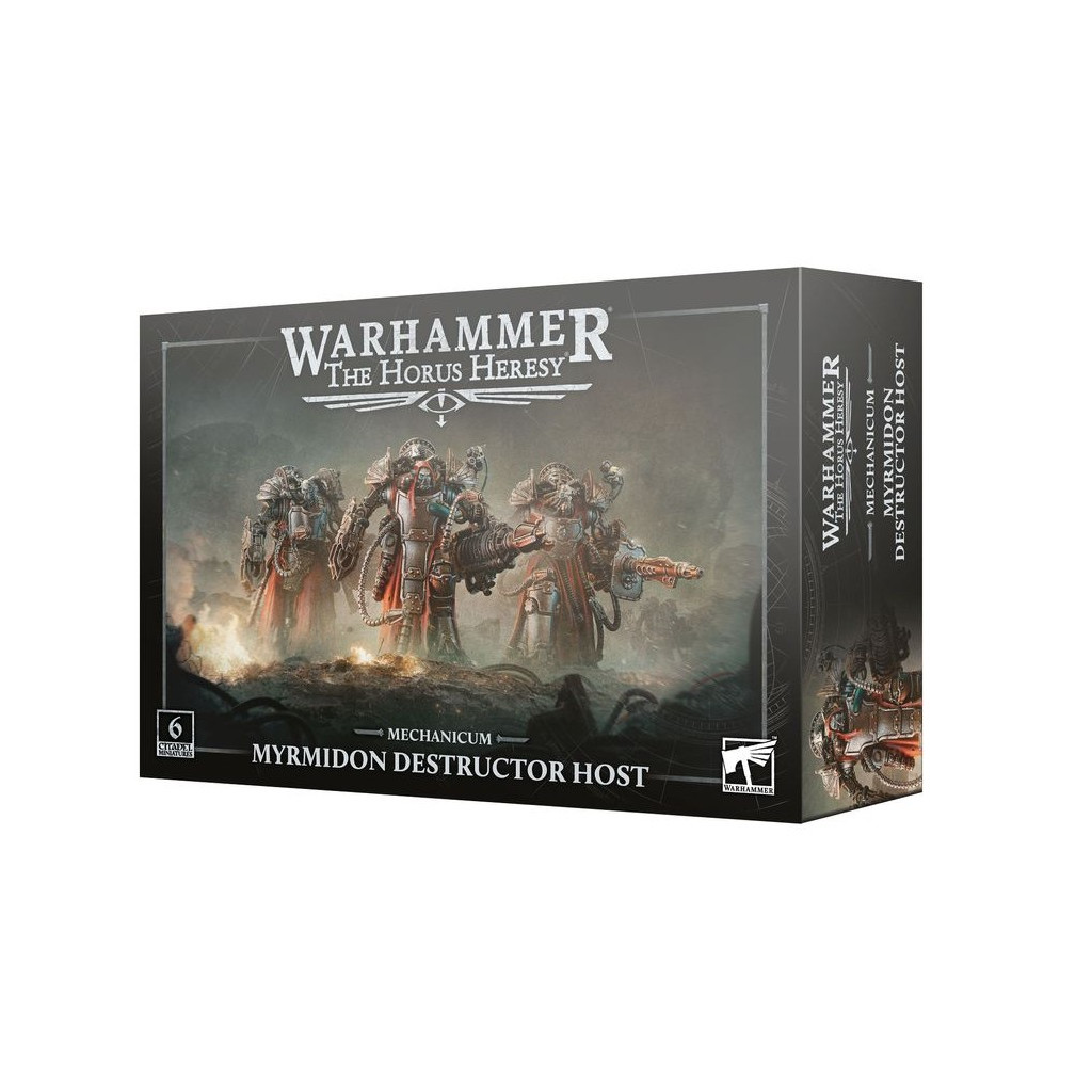 Ce kit en plastique permet d'assembler six Myrmidons Destructors, une infanterie lourde d'élite pour vos armées du Mechanicum dans les parties de Warhammer: The Horus Heresy. Ils peuvent être équipés de canons Darkfire antiblindages ou d'engins à irradiation faisant fondre l'infanterie, et quand la mêlée se referme, ils emploient alors leurs chargeurs-choc pour écraser leurs adversaires. Cette unité très résistante est un excellent moyen de fournir un tir de soutien au reste de votre armée tandis qu'elle progressera à ses côtés. Chaque Myrmidon Destructor dispose d'un choix de deux têtes, avec ou sans capuchon, et les six servocrânes fournis sont interchangeables entre les figurines.