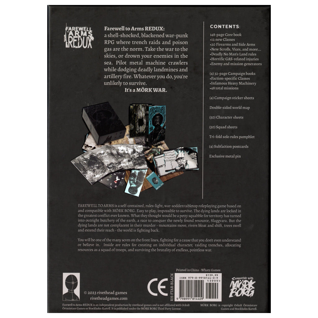 Ce coffret contient le livre de base Farewell to Arms REDUX ainsi que les 4 livrets de campagne et des accessoires de jeu.