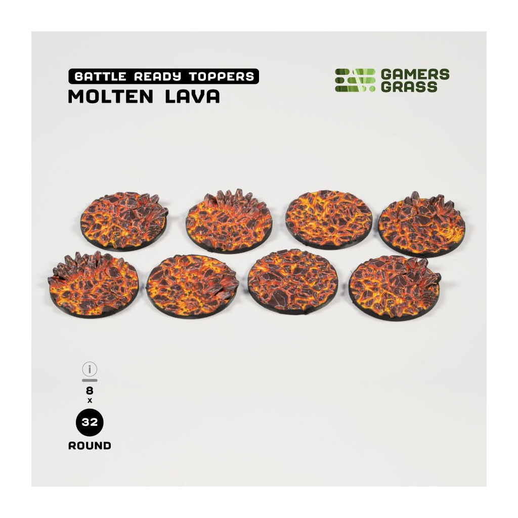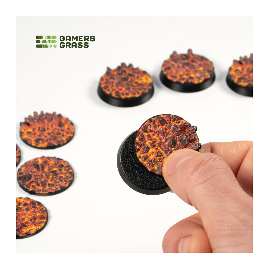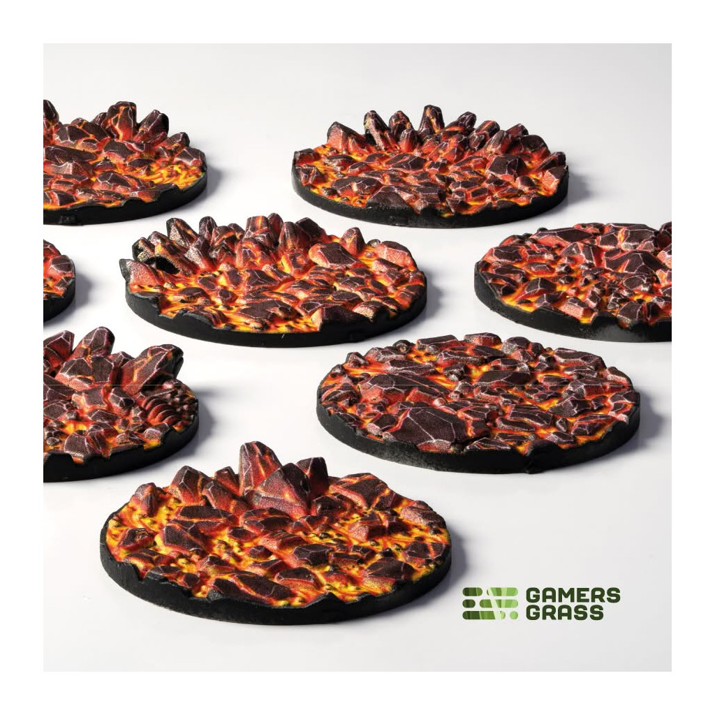 Le produit Molten Lava Bases, Round 32mm (x8) contient 8 socles ronds prépeints de 32mm de large illustrant des paysages infernaux ou des royaumes chaotiques.
