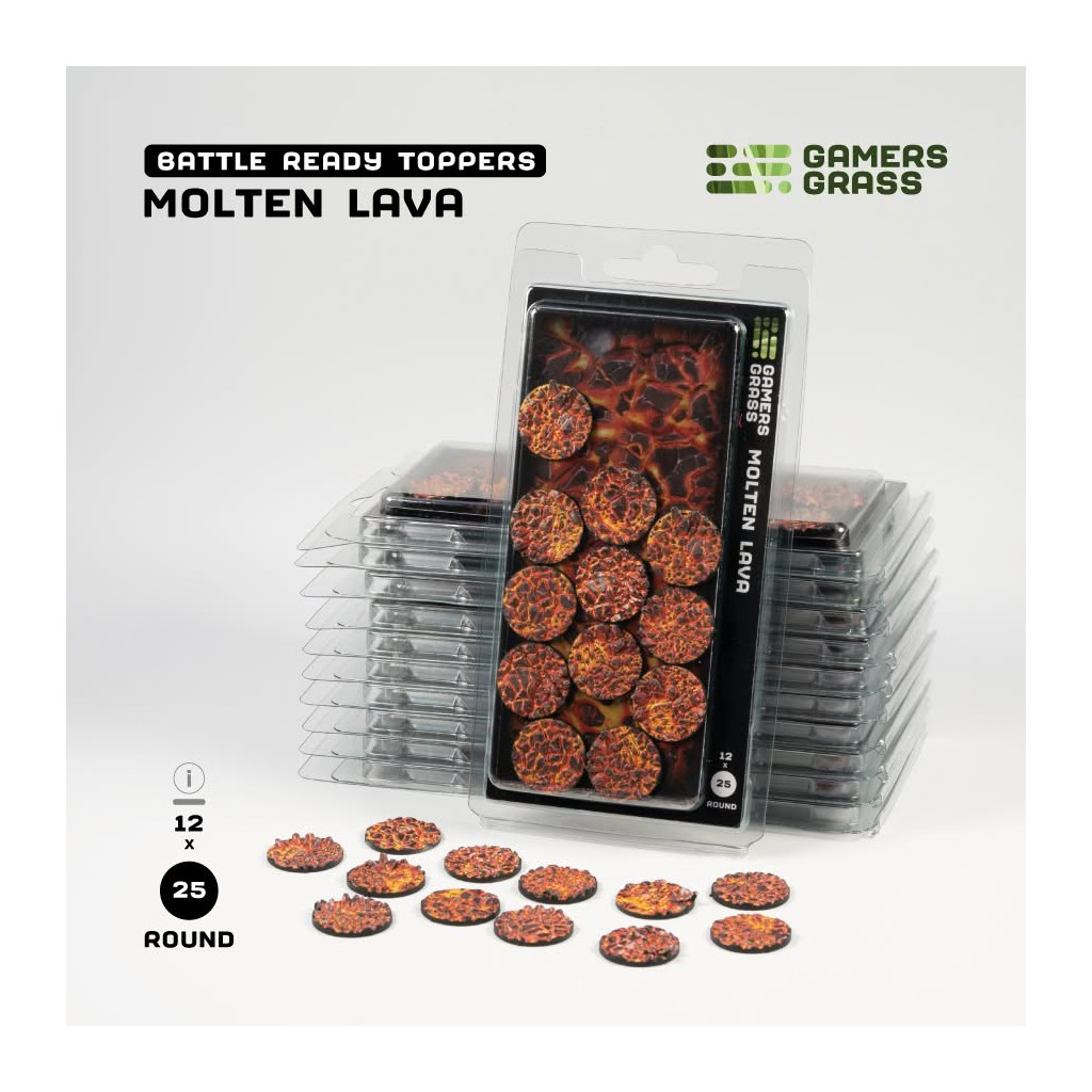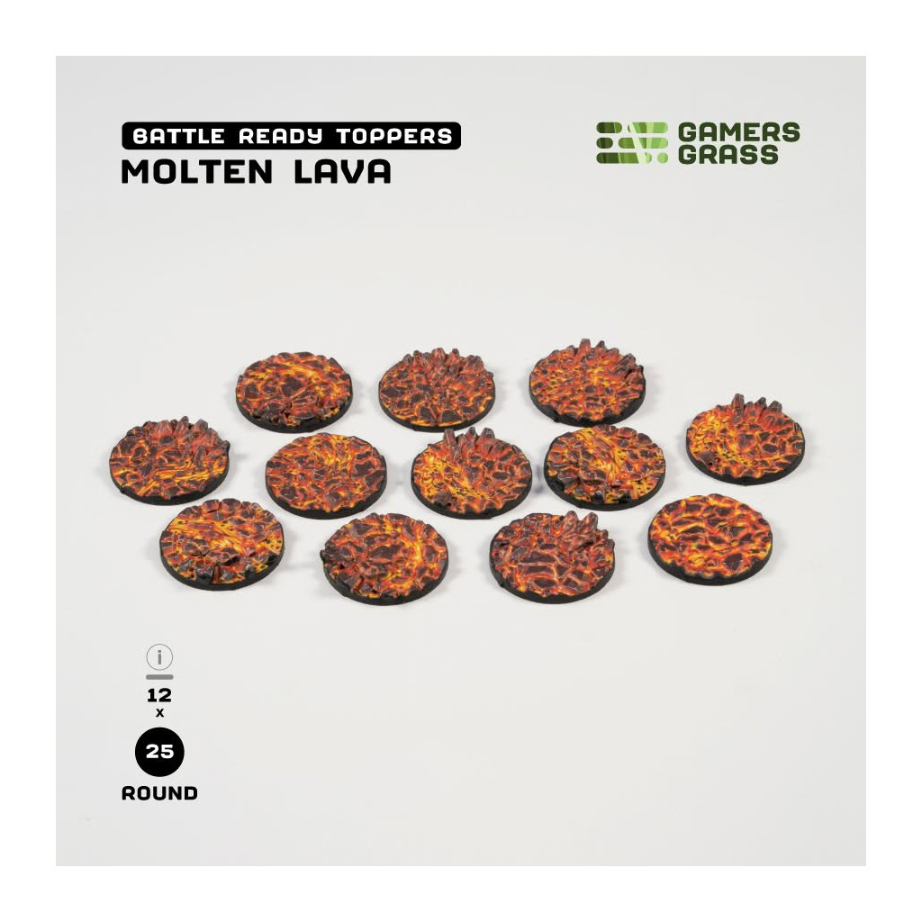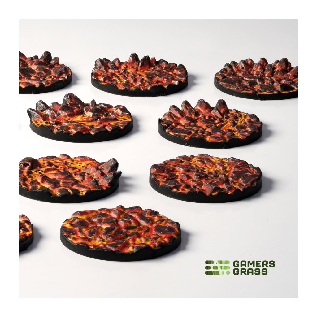 Le produit Molten Lava Bases, Round 25mm (x10) contient 10 socles ronds prépeints de 25mm de large illustrant des paysages infernaux ou des royaumes chaotiques.