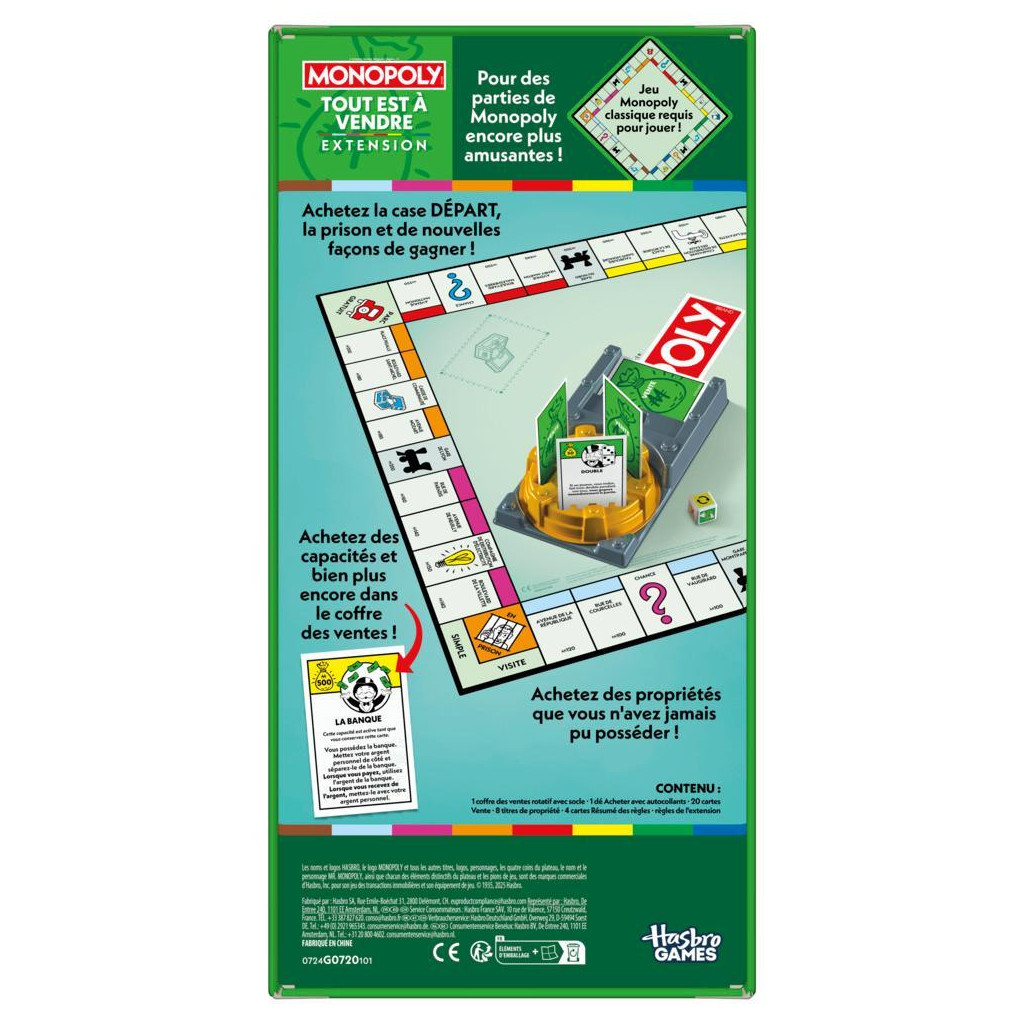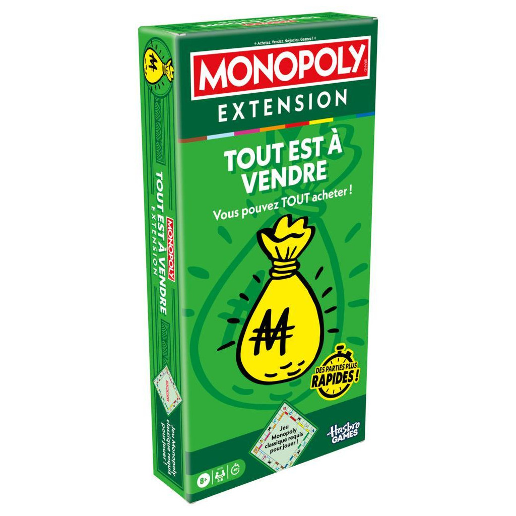 Mr. Monopoly a ouvert le coffre des ventes, et maintenant, on peut tout acheter ! Cette Extension Tout est à vendre du Monopoly apporte une touche de nouveauté au jeu Monopoly et les parties sont deux fois moins longues. Il suffit d'ajouter cette extension au jeu de plateau Monopoly classique pour que tout soit à vendre. (Jeu Monopoly classique requis pour jouer.) Les joueurs peuvent acheter toutes les cases du plateau et lancer le dé Acheter pour se procurer d'autres façons de gagner et des capacités en rotation dans le coffre des ventes. Quand toutes les propriétés ont été achetées, le joueur le plus riche gagne. La partie peut se terminer si un joueur gagne instantanément en complétant une carte Vente.