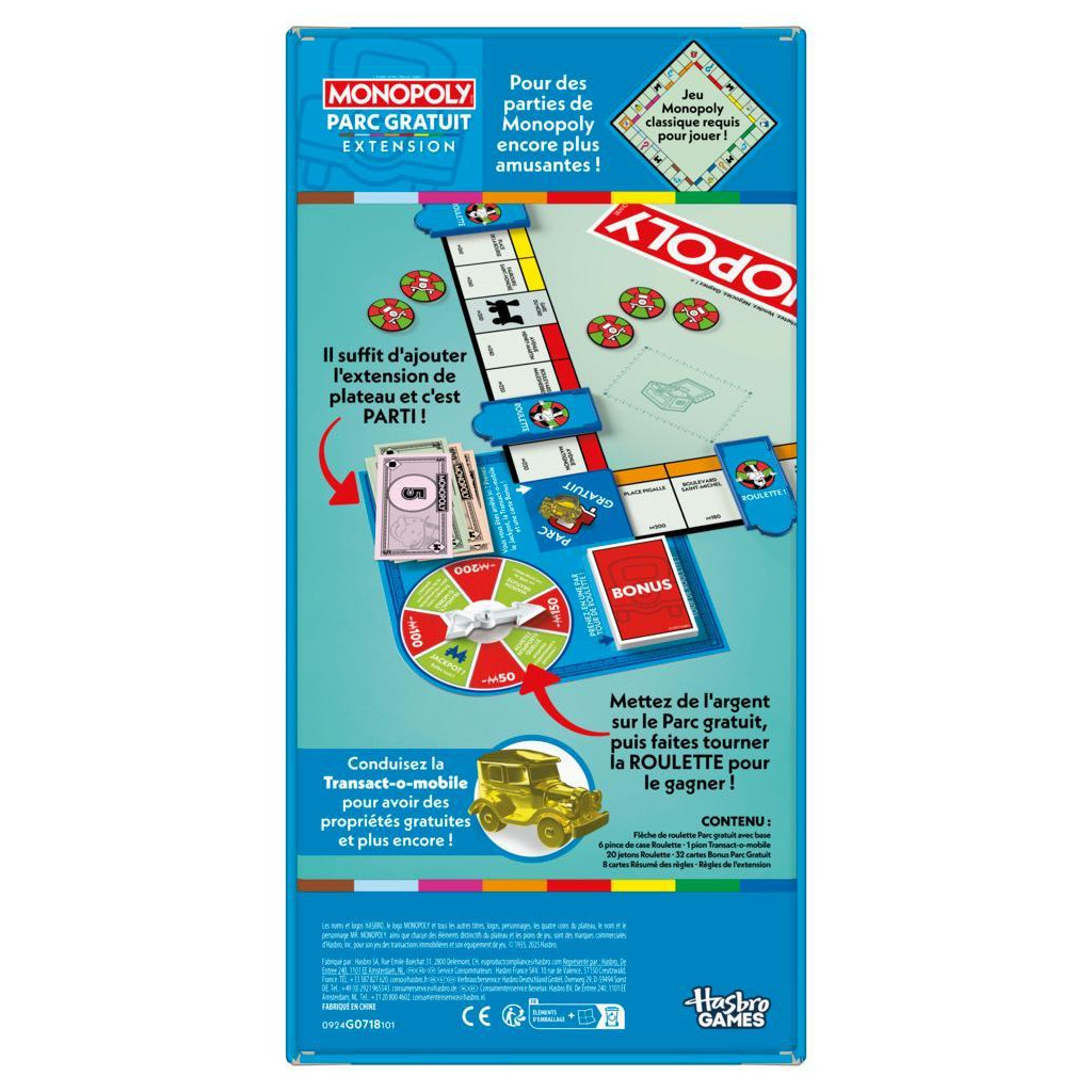 On tente sa chance, on amasse de l'argent ! Cette Extension Parc gratuit apporte une touche de nouveauté au jeu Monopoly et les parties sont deux fois moins longues. On peut intégrer cette extension au plateau de jeu classique du Monopoly et transformer la case Parc gratuit en cagnotte. (Jeu Monopoly classique requis pour jouer.) On tourne la roulette pour une chance de gagner GROS ! On peut prendre le contrôle du pion Transact-o-mobile et piocher des cartes Bonus pour obtenir des propriétés gratuitement et plus encore. La partie se termine quand toutes les propriétés ont été achetées ou quand un joueur a fait faillite. Le joueur le plus riche gagne !