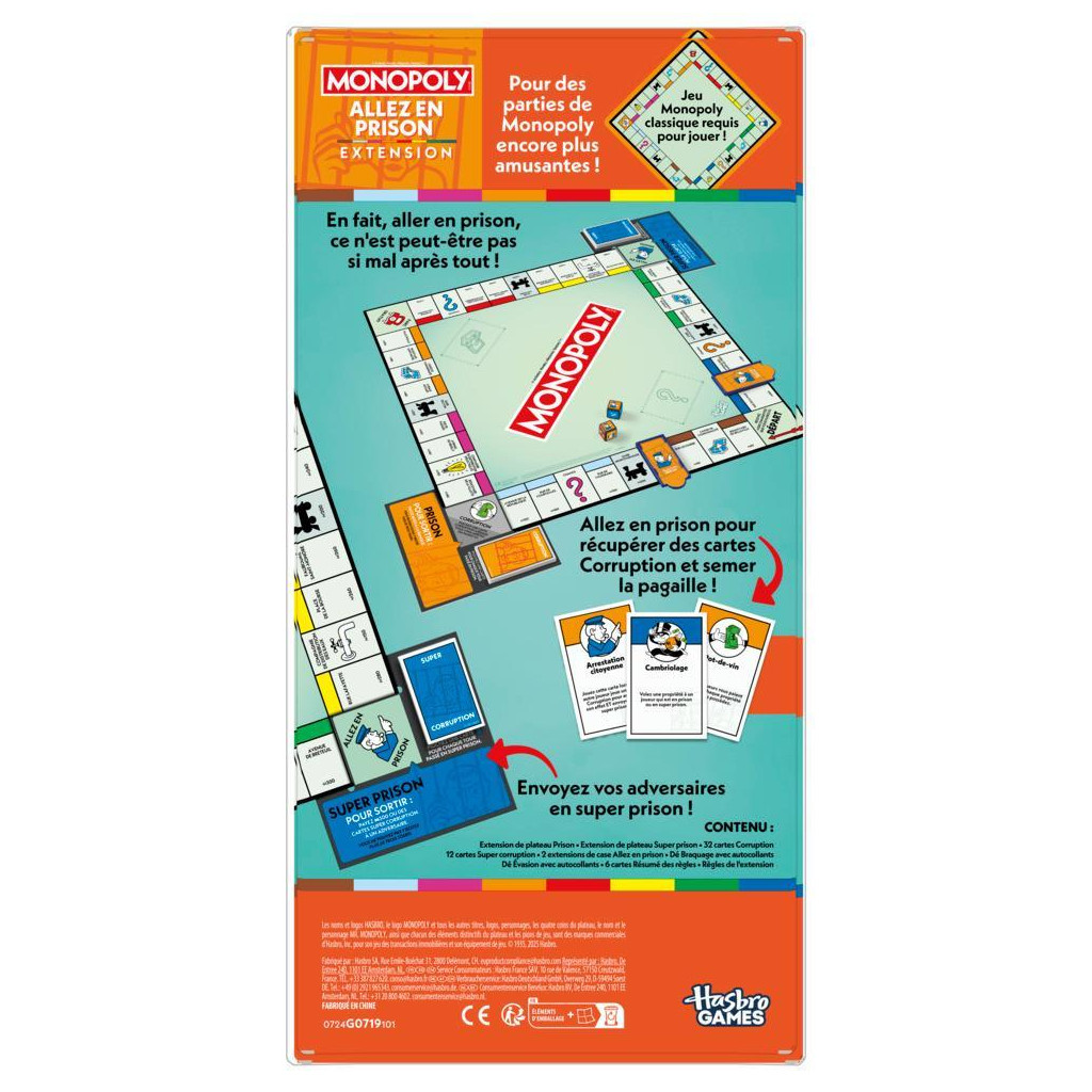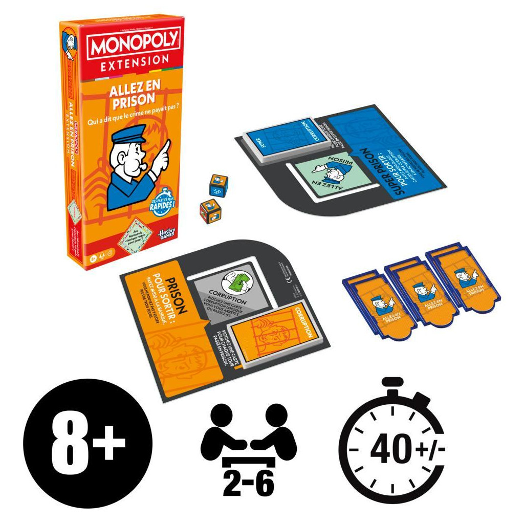 Qui a dit que le crime ne payait pas ? Cette Extension Allez en prison du Monopoly apporte une touche de nouveauté au jeu Monopoly et les parties sont deux fois moins longues. Il suffit d'ajouter cette extension au plateau du Monopoly classique pour transformer les cases Prison et Allez en prison en d'autres lieux. Lorsqu'ils s'y arrêtent, les joueurs reçoivent des cartes Corruption et Super corruption qui leur permettent de semer la pagaille sans conséquence et d'obtenir des avantages sur les autres joueurs ! La partie se termine quand toutes les propriétés ont été achetées ou quand un joueur a fait faillite. Le joueur le plus riche gagne !