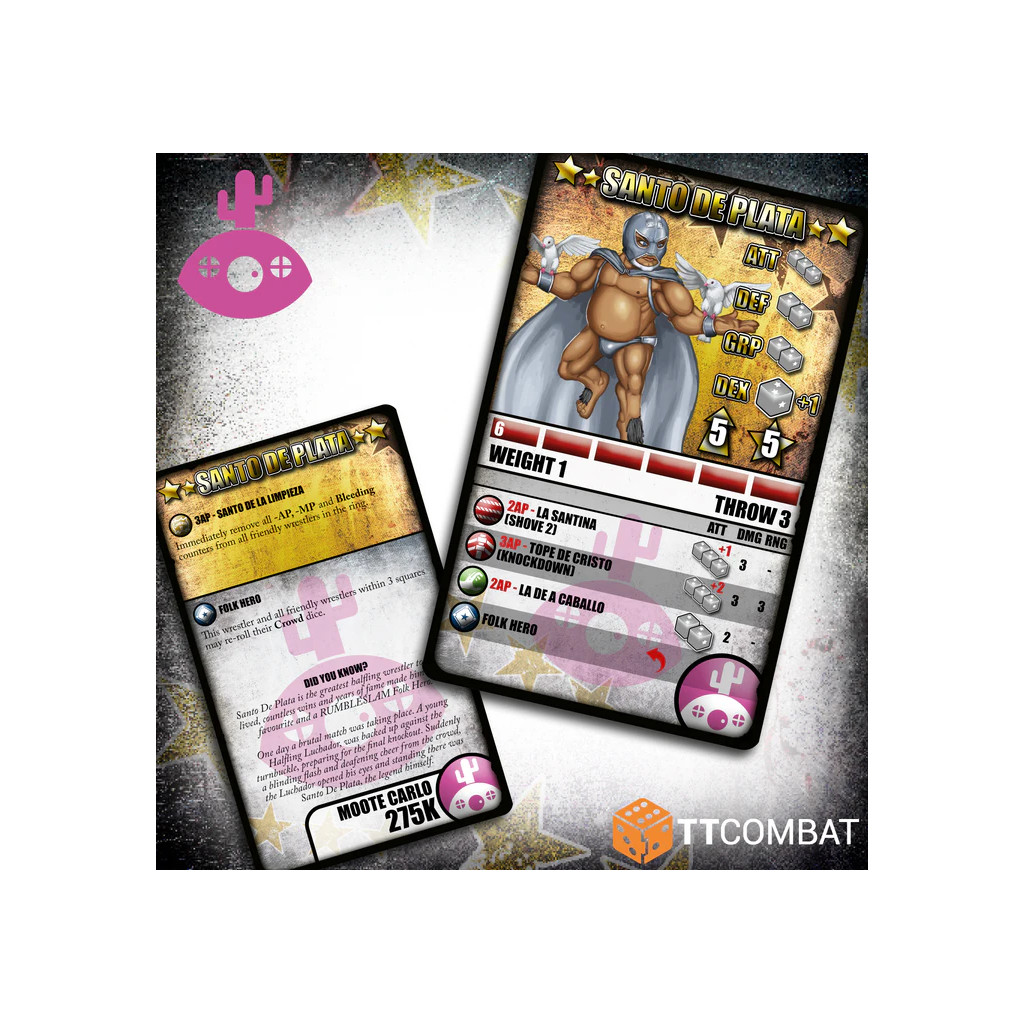 Santo De Plata est le plus grand catcheur halfling de tous les temps ; ses innombrables victoires et ses années de gloire ont fait de lui un chouchou du public et un héros populaire du RUMBLESLAM.