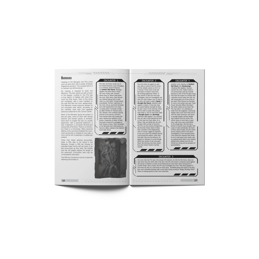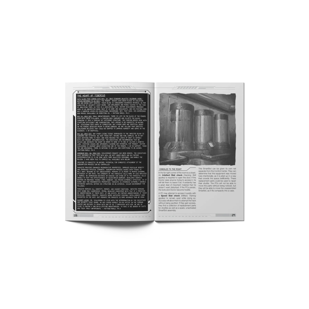 Dans ce module d’aventure, les joueurs incarnent des agents sous contrat gouvernemental chargés d’évaluer la légalité des déclarations faites par le propriétaire de la mine Tiberius, Caltari Industries. Mais ce qu’ils trouvent sur la station Tiberius est bien loin de manipulations du marché mondial. Les personnages découvrent immédiatement quelque chose de bien plus sinistre, et n’auront pas d’autre choix que de s’adapter… ou de mourir.