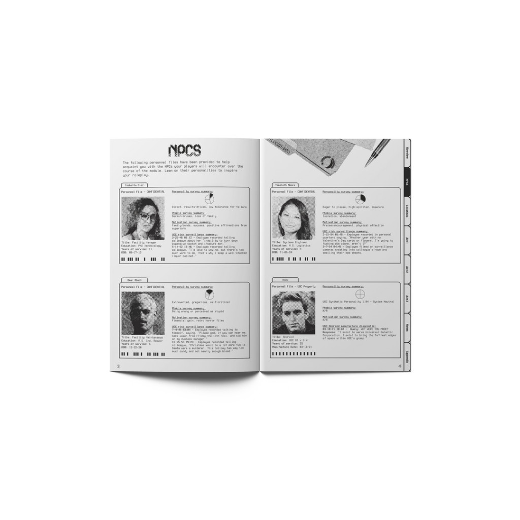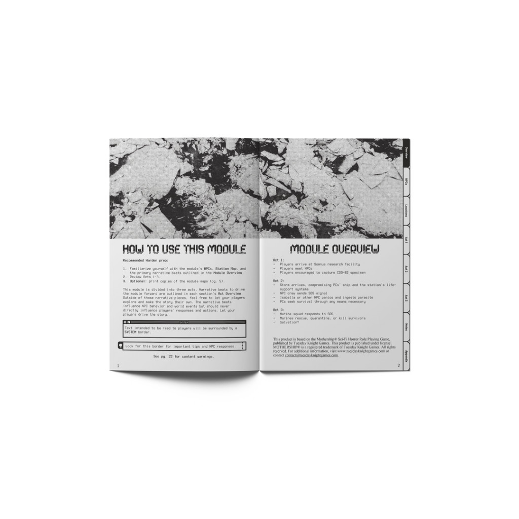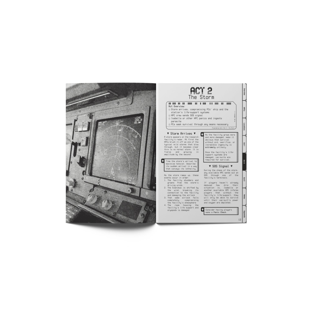 Contre des probabilités écrasantes, vos joueurs devront se demander jusqu’où ils sont prêts à aller pour survivre. Se laisseront-ils volontairement envahir par un parasite capable de les aider à résister à l’environnement mortel d’une planète glacée ? Ou s’appuieront-ils sur leur ingéniosité — et sur la chance aux dés — pour mettre au point une solution dans une station paralysée par une tempête brutale ?