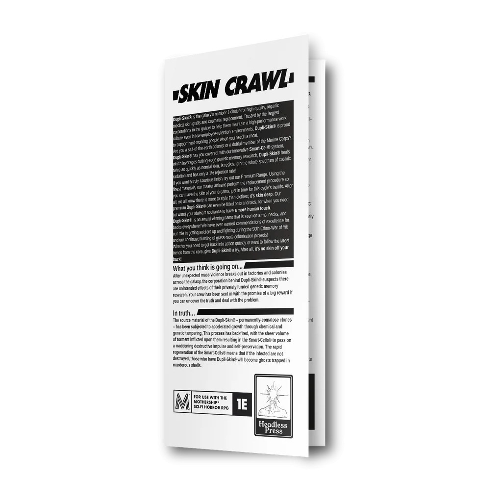 Skin Crawl est un module de « body horror » (horreur corporelle) sous-cutané de type « point-crawl », créé dans le cadre de la Game Jam TripTech. Après que des violences de masse inattendues ont éclaté dans des usines et des colonies à travers la galaxie, la corporation derrière Dupli-Skin soupçonne des effets indésirables issus de ses recherches privées sur la mémoire génétique.