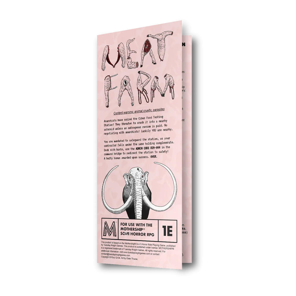 Meat Farm est une aventure au format dépliant trois volets bien saignante, compatible avec le JdR d'horreur sci-fi Mothership 1e. Conçue comme un one-shot, elle peut également être intégrée en tant que lieu et mission dans n'importe quelle campagne.