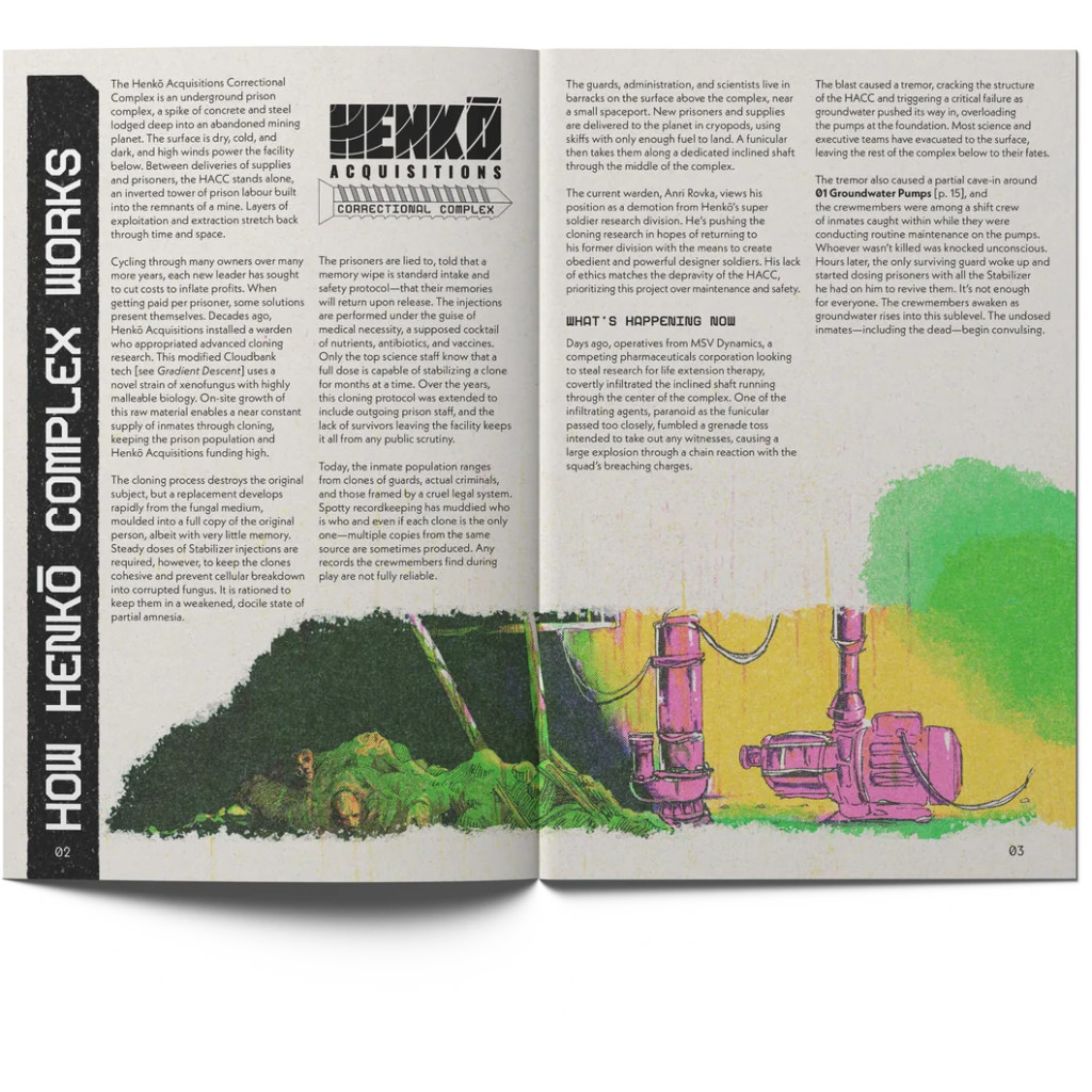 Le Complexe Correctionnel Henkō Acquisitions est une prison souterraine, un pic de béton et d'acier enfoncé profondément dans une planète minière abandonnée. La surface est aride, froide et sombre, et des vents violents alimentent l'installation en contrebas. Entre les livraisons de fournitures et de prisonniers, le HACC se dresse seul, une tour inversée de travail carcéral bâtie dans les vestiges d'une mine. Des couches d'exploitation et d'extraction s'étirent à travers le temps et l'espace.