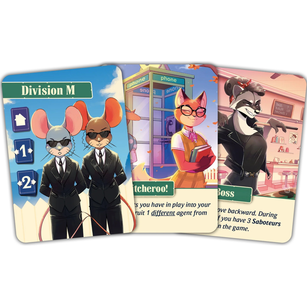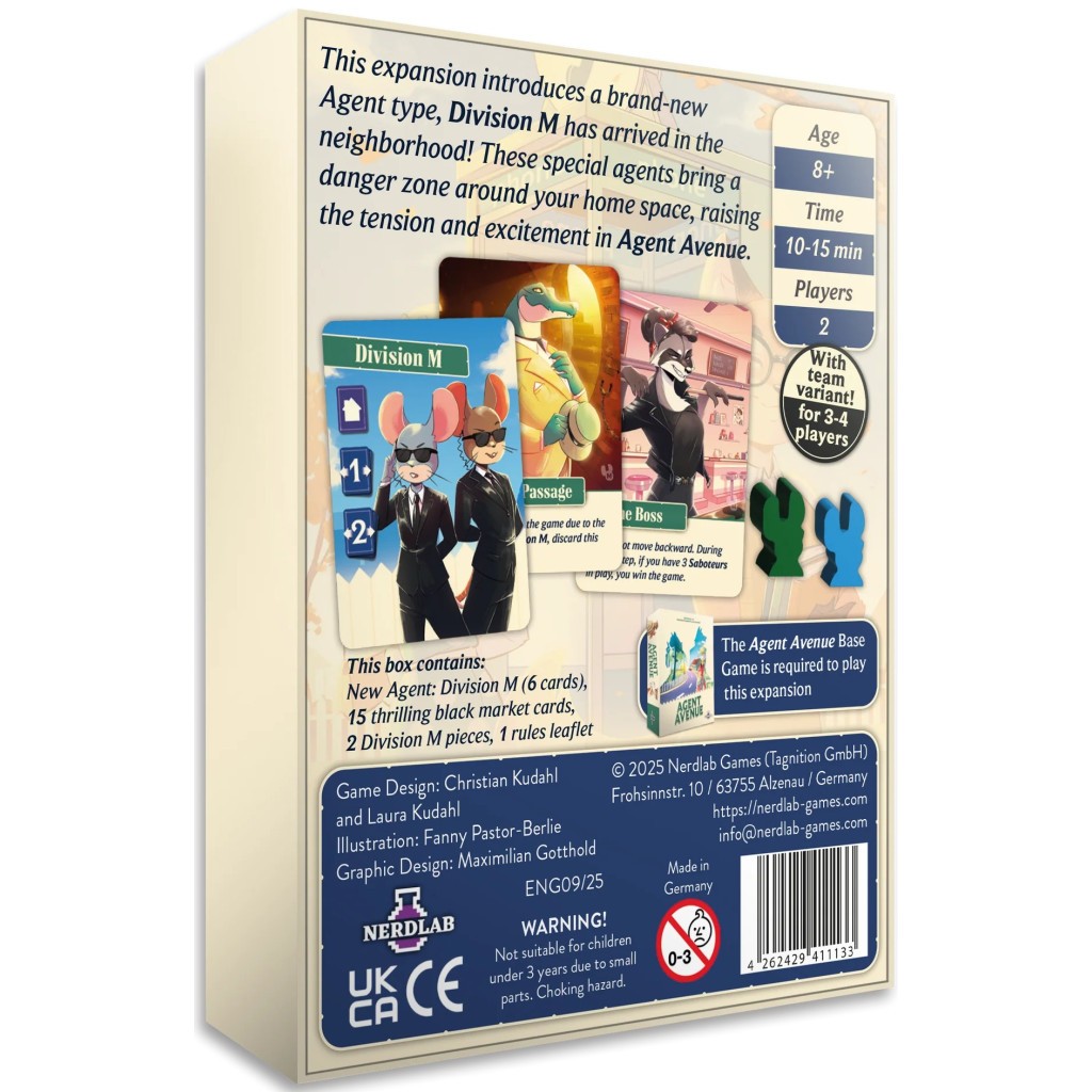 Agent Avenue – Division M est une extension passionnante, qui introduit un tout nouveau type d'agent : les souris de la Division M. Ces agents rusés créent une zone dangereuse autour de votre espace de jeu, ajoutant ainsi une nouvelle dimension stratégique, du suspense et du piquant à chaque partie d'Agent Avenue.