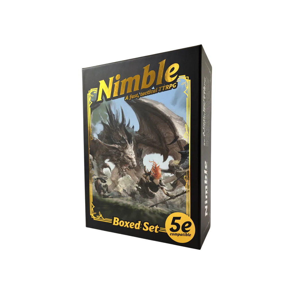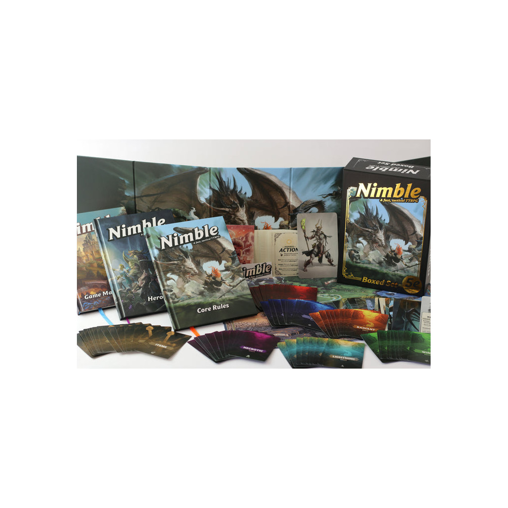 Nimble est un jeu de rôle rapide, tactique et compatible avec la 5e édition, qui élimine la lourdeur des parties en reprenant seulement le meilleur des plus grands RPG. Moins d’attente, plus de liberté pour la créativité et le travail d’équipe, plus simple à gérer pour le MJ et plus facile à prendre en main pour les nouveaux joueurs, afin de faire grandir ce merveilleux hobby.