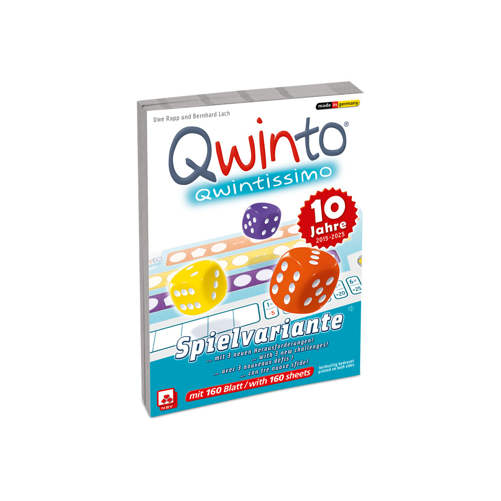 Le jeu de dés QWINTO, qui suit les traces du bestseller Qwixx, compte désormais des fans fidèles depuis 10 ans. Cela mérite d’être célébré comme il se doit. Pour marquer cet anniversaire, QWINTISSIMO est le tout premier bloc de variantes pour le jeu Qwinto.