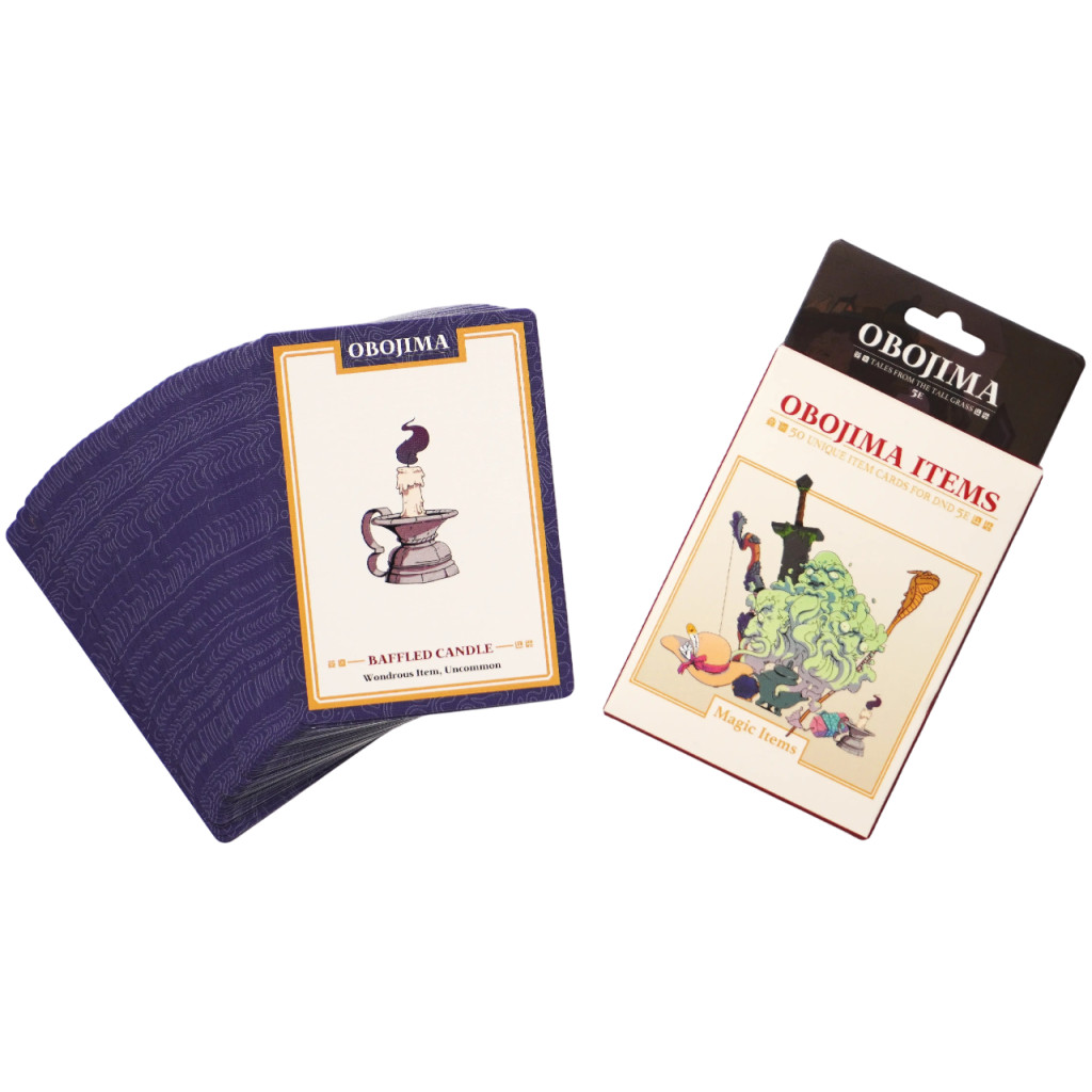Plongez dans l’univers d’Obojima grâce à ce set de cartes d’objets magiques au format carte à jouer. Chaque carte est magnifiquement illustrée et accompagnée d’une description détaillée avec toutes les caractéristiques nécessaires pour vos aventures.
