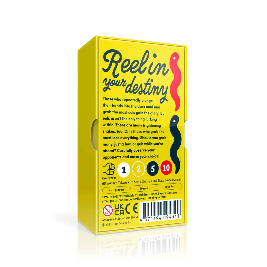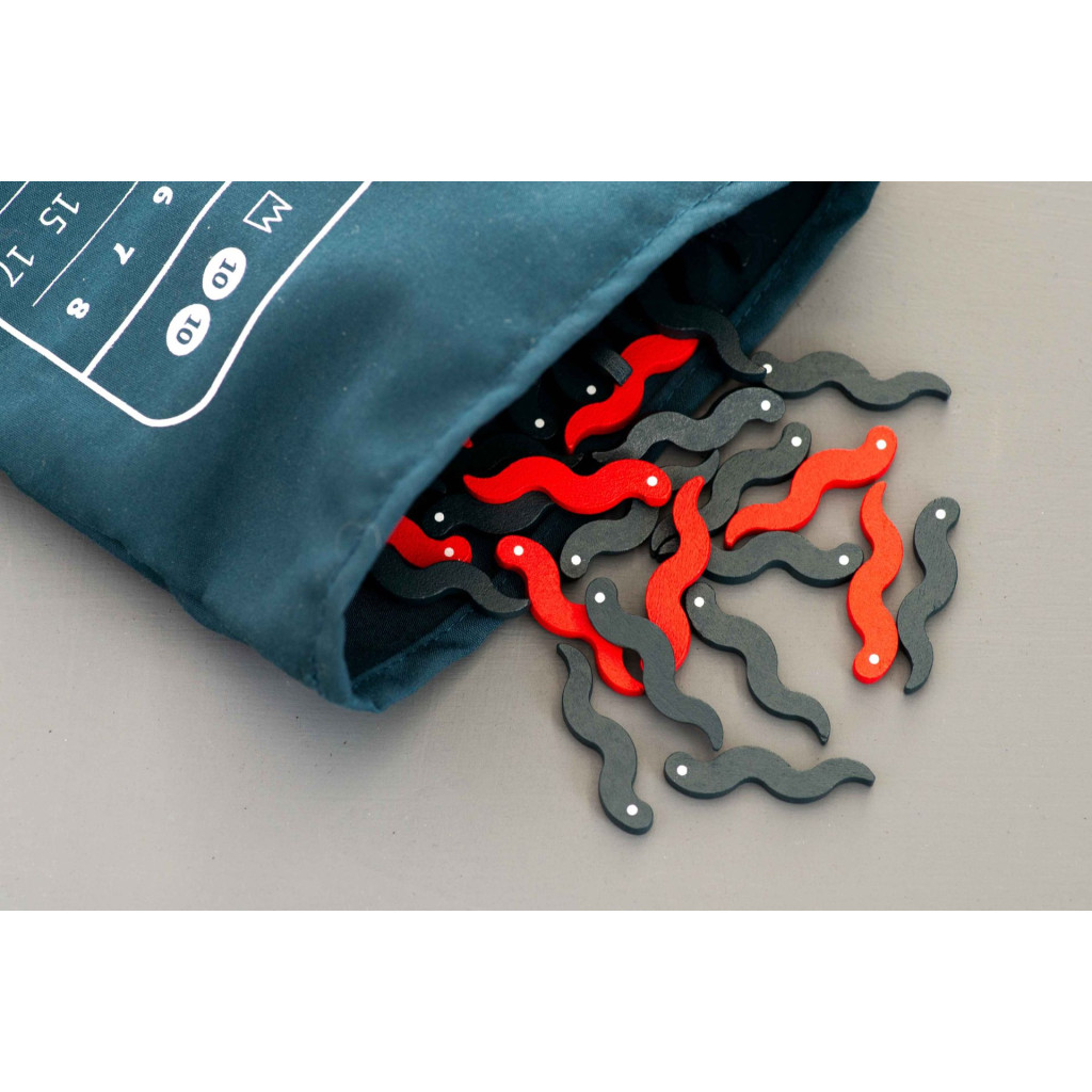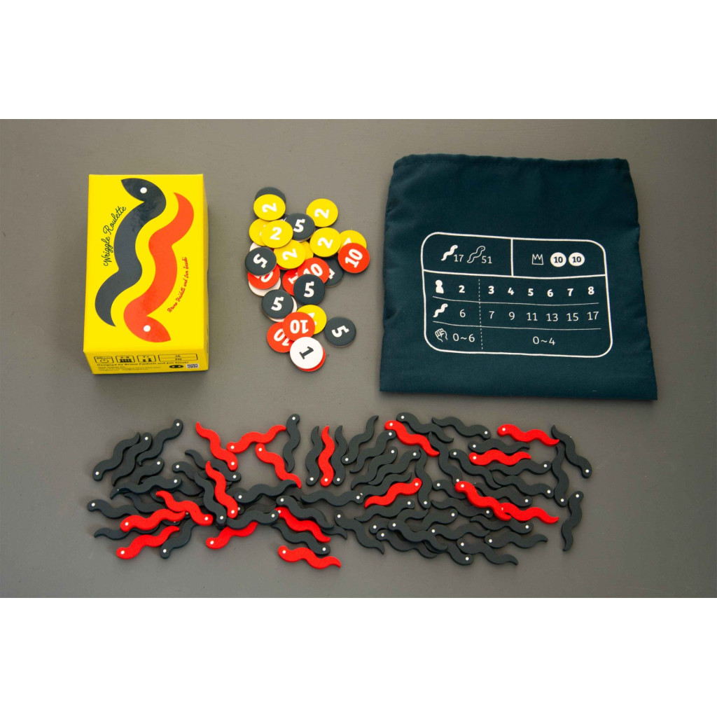 Wriggle Roulette est un jeu qui mêle chance et stratégie. Les joueurs, à tour de rôle, plongent la main dans un sac rempli de pièces en bois en forme d’anguilles et de serpents, en essayant d’en tirer le plus d’anguilles possible. Mais attention : si le nombre total de serpents attrapés par tous les joueurs dépasse la limite, une « invasion de serpents » se déclenche, et le joueur qui a pris le plus de pièces perd toutes ses anguilles. Vous voulez en attraper plus que les autres pour marquer gros, mais une invasion serait catastrophique…