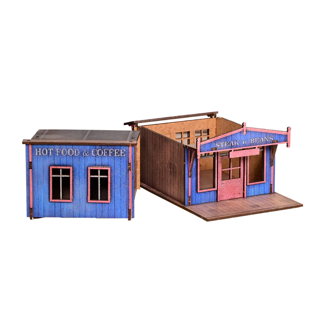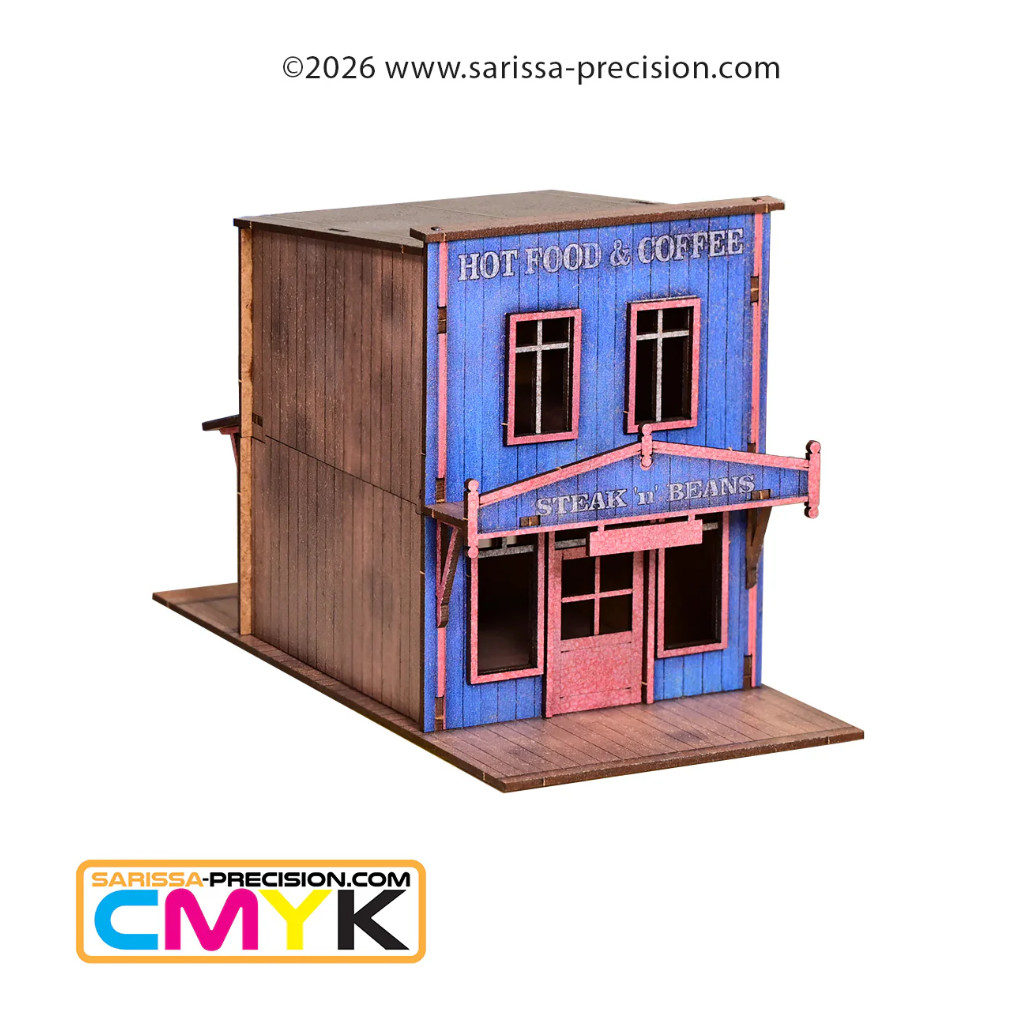 Old West - Steak n Beans Coffee House Steak “n” Beans Coffee House Le grand bâtiment à la façade bleue situé sur Main Street abrite le Steak “n” Beans, l'endroit le plus populaire de Redrock Falls pour manger, boire et écouter de la musique. De l'aube jusqu'à bien après minuit, l'odeur du café chaud, du bœuf frit et des haricots mijotés se répand sur la promenade, attirant les mineurs, les ouvriers agricoles, les joueurs et tous ceux qui ont encore quelques pièces en poche. L'établissement est tenu par Martha « Ma » Berrigan, une veuve au regard perçant, une louche dans une main et un fusil sous le comptoir. Elle connaît tous les visages de la ville et sait exactement quels problèmes ils peuvent causer. Les affaires se concluent autour d'une tasse de café, les disputes se règlent dans les box, et plus d'une prime a été négociée discrètement sous prétexte d'étudier le menu. À l'étage, quelques chambres exiguës sont réservées à ceux qui ont besoin d'un lit et ne posent pas de questions, mais c'est au rez-de-chaussée, autour d'assiettes de steak et de haricots, que se déroulent les véritables affaires de Redrock Falls. Si vous voulez savoir ce qui se passe vraiment en ville, n'allez pas voir le shérif, installez-vous au comptoir de Ma Berrigan et écoutez. Livré non assemblé avec instructions complètes. Aucune peinture requise ! Il suffit de détacher les pièces et de les coller ensemble. Les modèles ou accessoires présentés sont uniquement à des fins d'échelle et ne sont pas inclus. Dimensions L100 x H122 x P190 mm Matériau MDF 2 mm Contenu 1 bâtiment imprimé Sarissa-CMYK