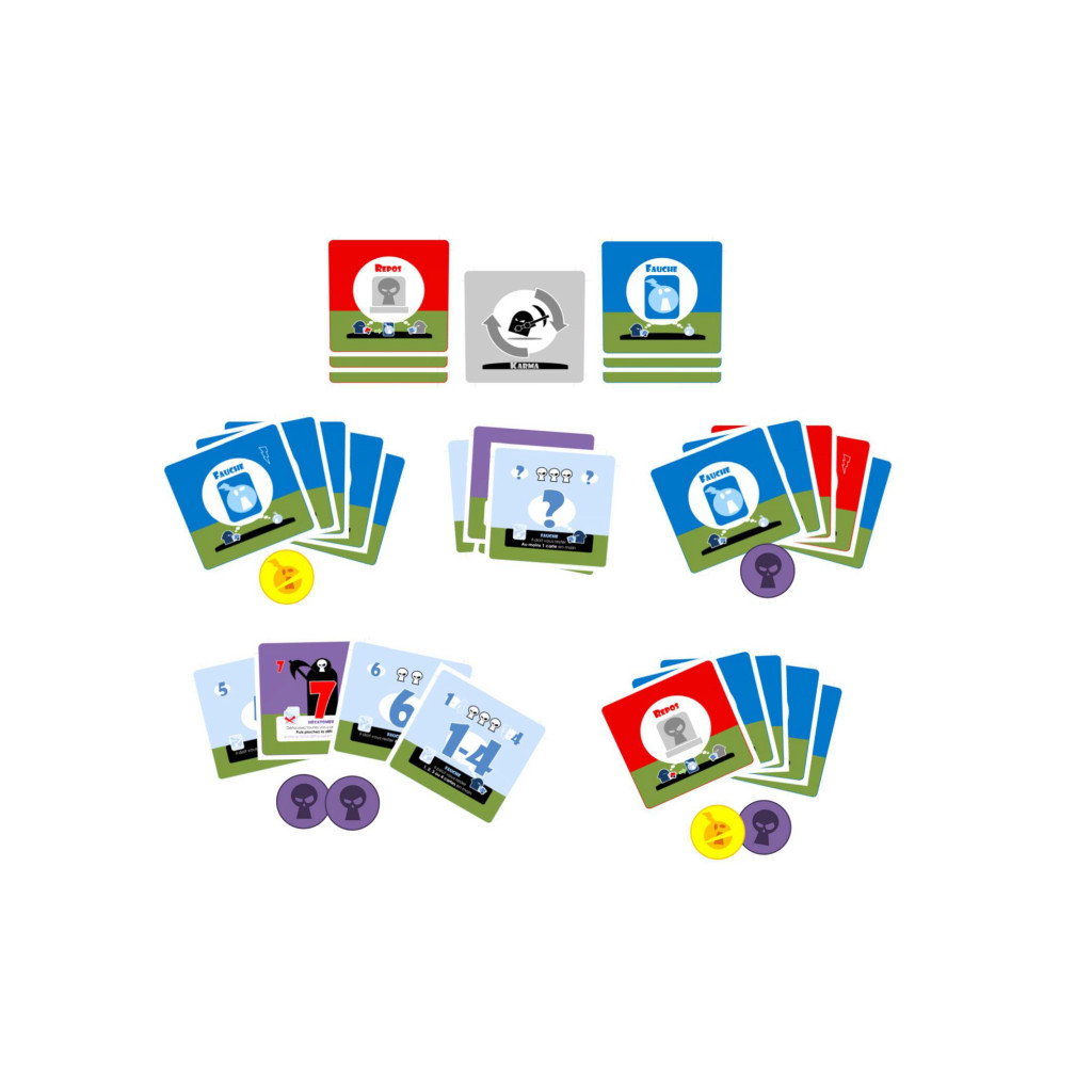 Quand vous jouez une carte Fauche au centre, la valeur indiquée doit correspondre au nombre de cartes qu’il vous reste en main à la fin de votre tour. Ex : vous jouez un « 4 », il doit vous rester 4 cartes en main.