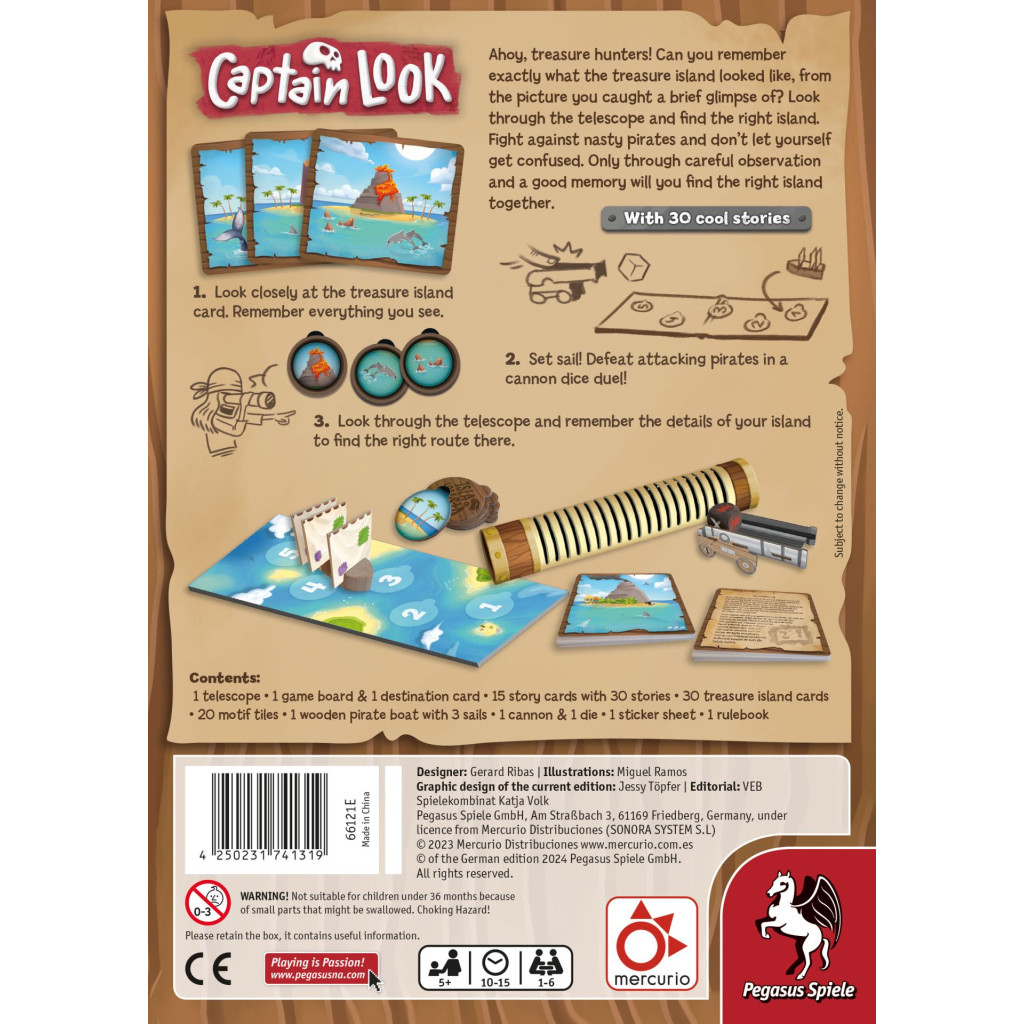 En plus d'un mode solo, Captain Look propose également un ensemble de règles avancées et une variante avec des phoques, qui non seulement ajoutent de la variété, mais apportent aussi de nouveaux défis au jeu. Sont également inclus 30 contes populaires maritimes passionnants qui renforcent l'ambiance pirate.