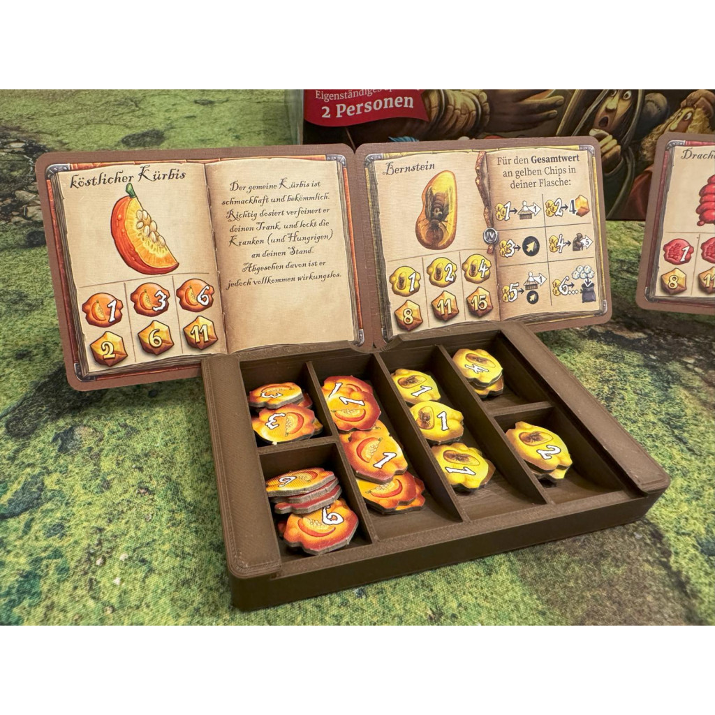 Toutes les boîtes disposent d'un emplacement pour les variantes de livre d'ingrédients, qui fait office de couvercle pratique. Toutes les boîtes disposent d'une fente au dos permettant de placer les livrets d'ingrédients en biais. L'intérieur arrondi facilite grandement la prise en main des ingrédients. Tout s'intègre parfaitement dans la boîte de jeu d'origine, avec son couvercle entièrement fermé. Aucun soulèvement du couvercle n'est nécessaire.