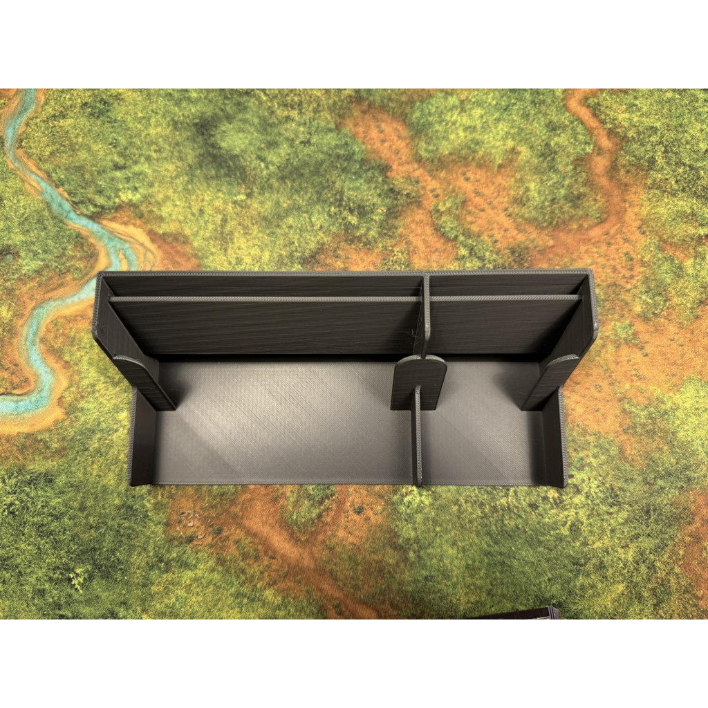 Cthulhu Death May Die prend beaucoup de place sur la table. Mon amélioration vous offre un peu plus d'espace et est également utile pour le déroulement de la phase du Mythe. Il y a trois emplacements en haut pour les mauvaises cartes Mythos. Les cartes Mythos sont toujours placées à l'endroit, face cachée, dans le support, et les cartes normales peuvent être placées à l'avant. Les cartes découvertes se rangent également parfaitement dans le long emplacement, et la carte actuelle peut être révélée en bas.