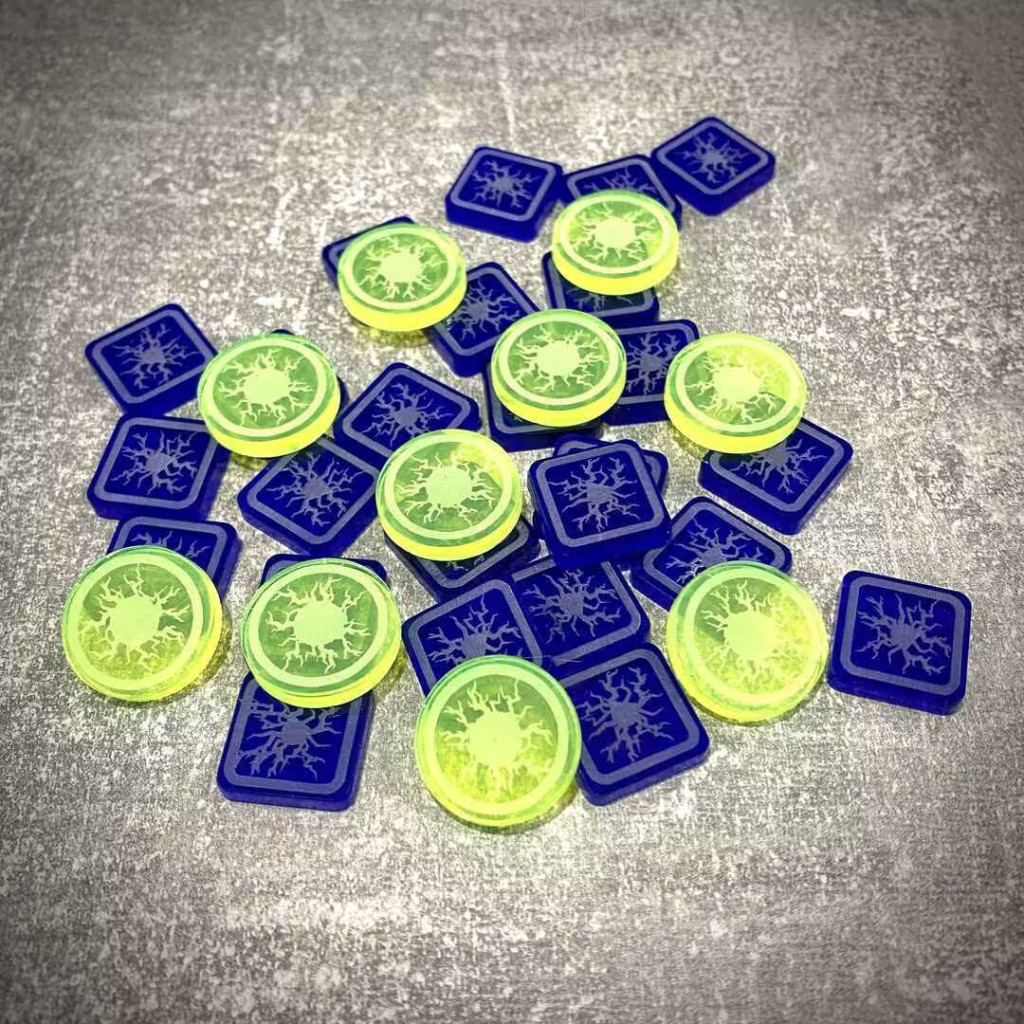 Améliorez vos accessoires de jeu grâce à ces jetons « Charge » et « Puissance » en acrylique pour Aeon's End ! Remplacez les jetons en carton par ces jetons en acrylique de haute qualité, qui offrent une meilleure résistance à l'usure. Ce lot comprend 24 jetons « Charge » en acrylique transparent bleu foncé et 10 jetons « Puissance » jaunes fluo, pour une amélioration élégante et durable de votre expérience de jeu.