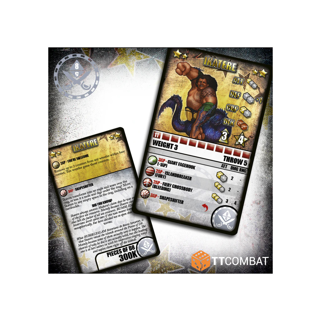 Enfin, Fiery Crossbody inflige d'énormes dégâts et donne à la cible un compteur Bleeding, infligeant encore plus de dégâts. Shapeshifter est une capacité Activate qui permet à Ikatere de s'envoler dans les airs ou de creuser sous le ring, au choix du joueur. You're Welcome est un Crowd-Pleaser qui transfère les compteurs des autres lutteurs à Ikatere, lui permettant ainsi de récolter les fruits de leur dur labeur.