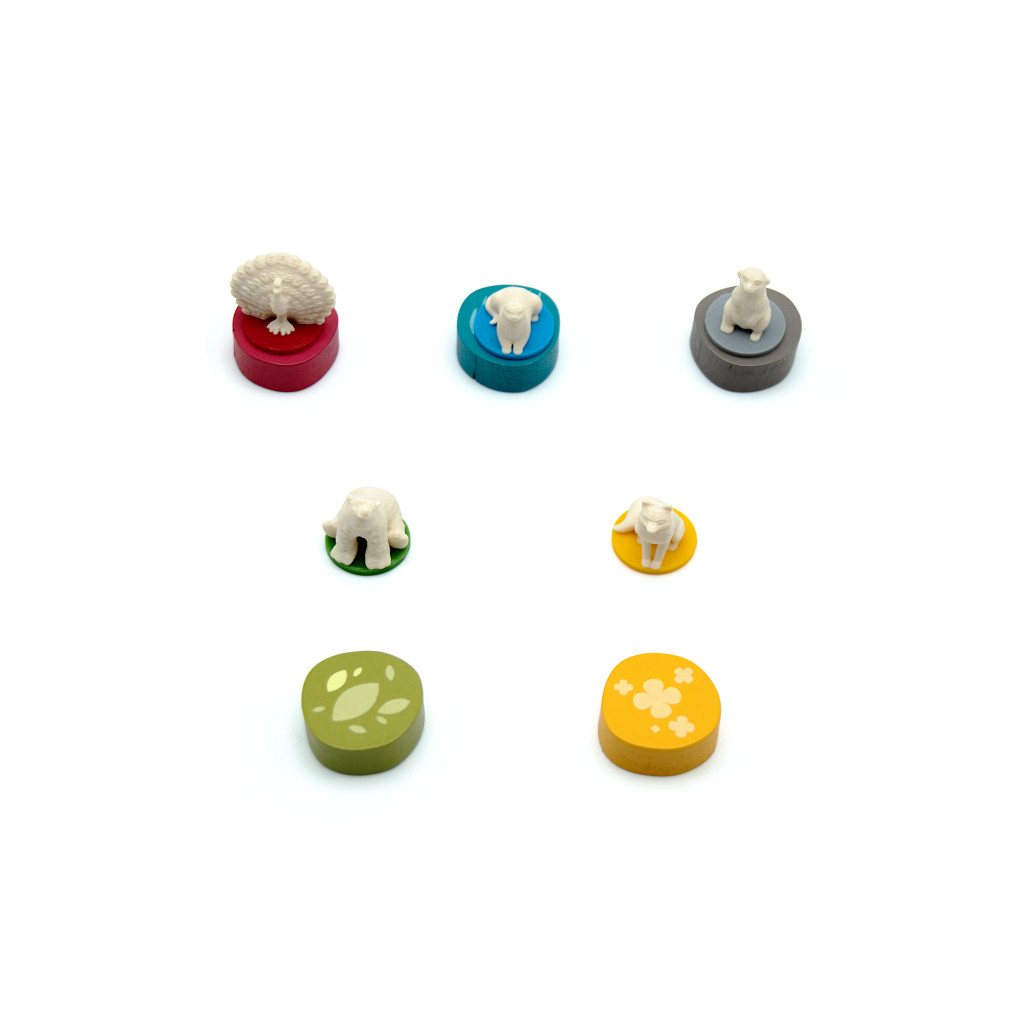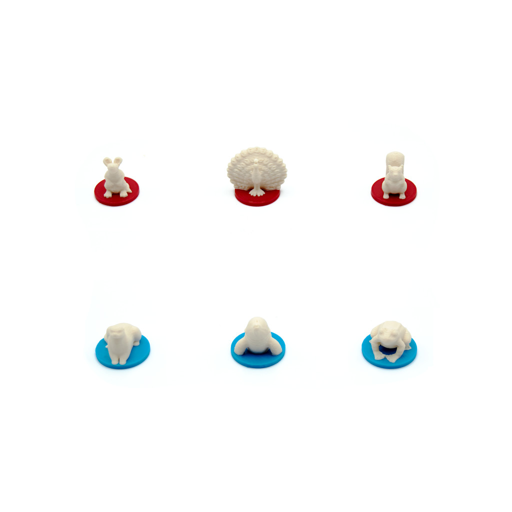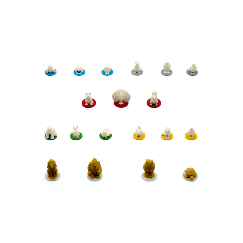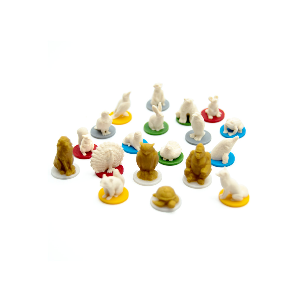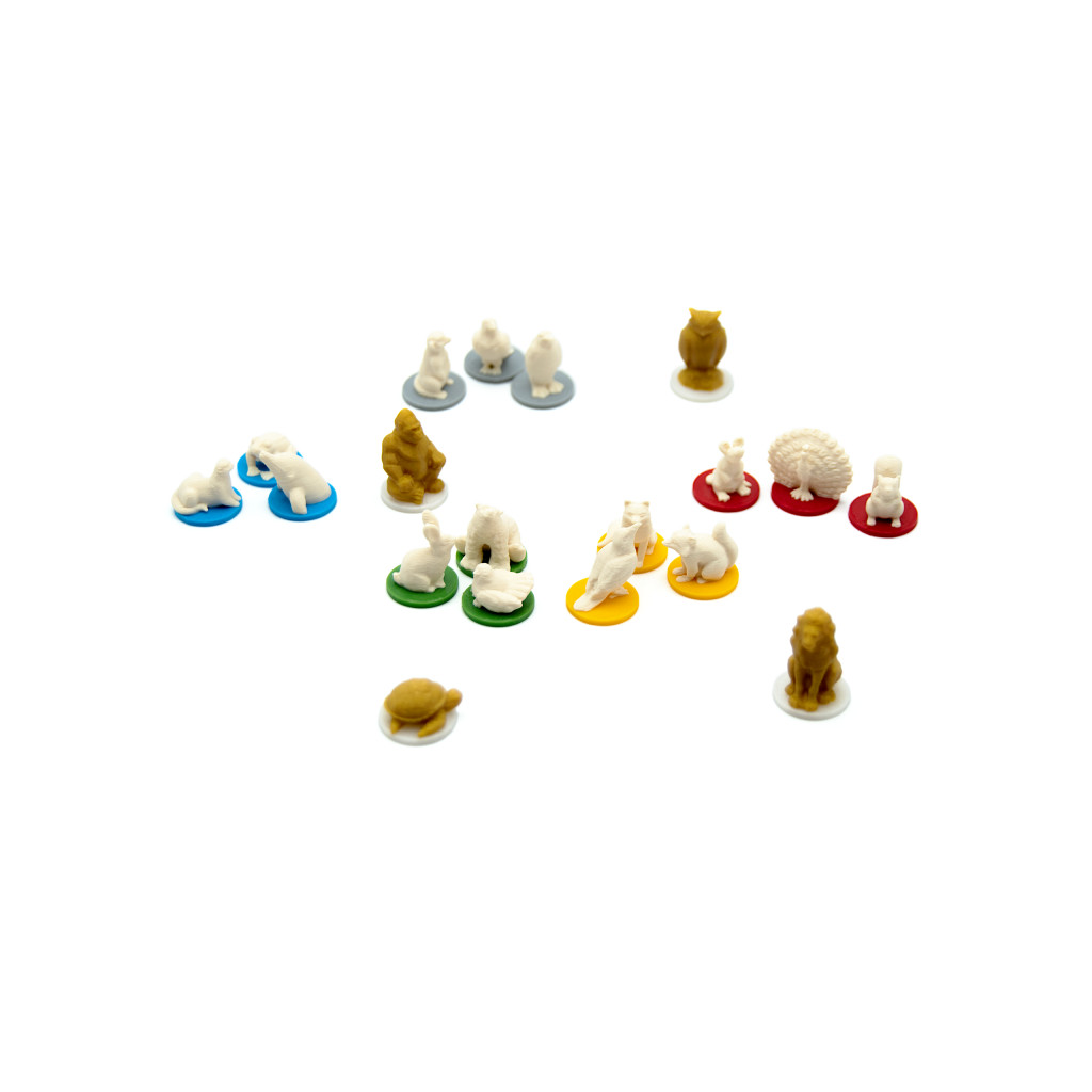 Chaque pion animal représente une espèce différente, montée sur un socle coloré correspondant aux habitats du jeu : bleu, gris, vert, jaune et rouge.