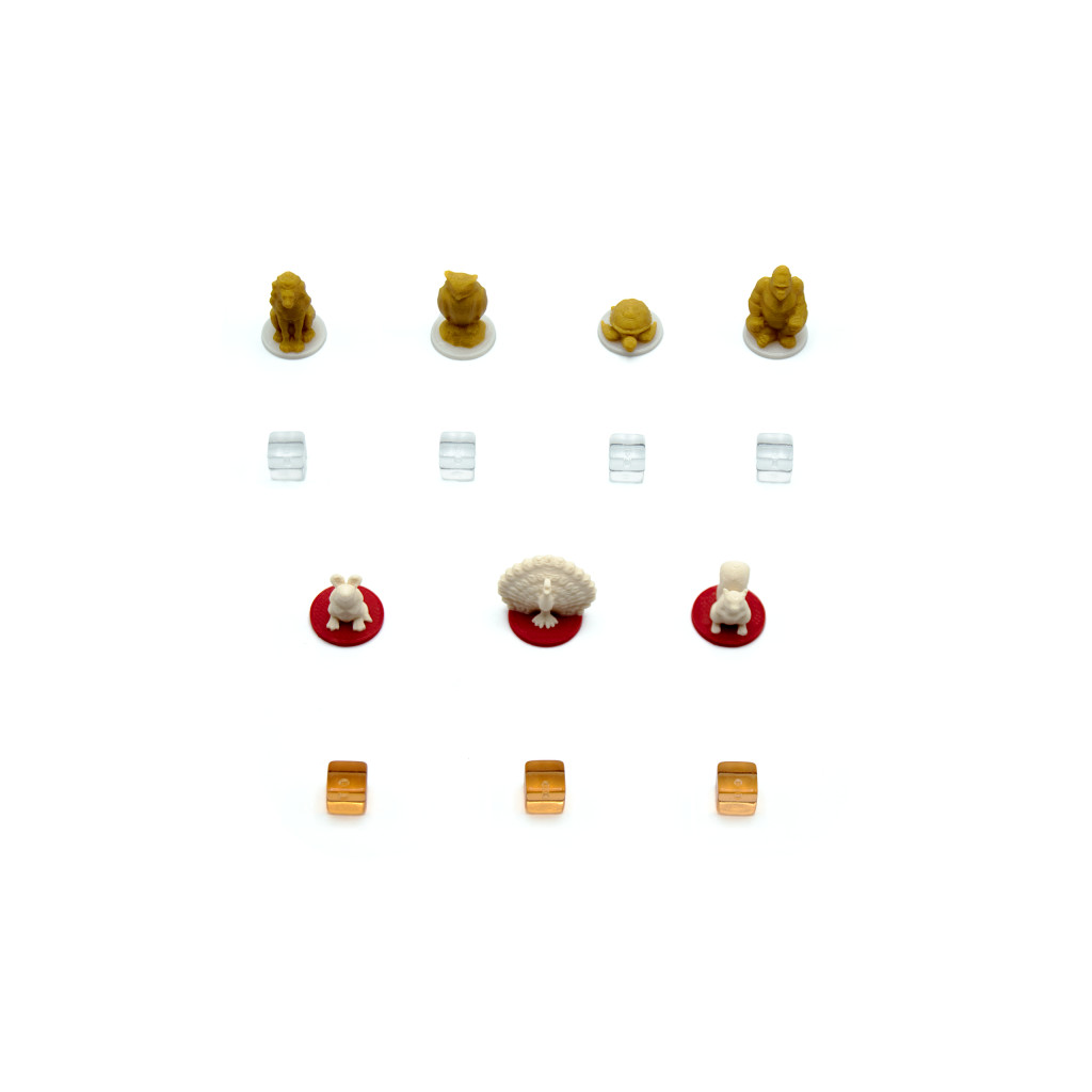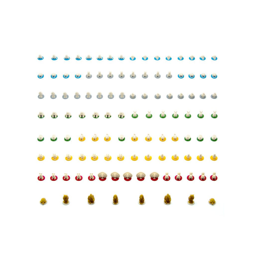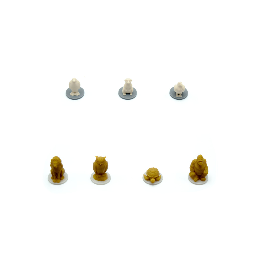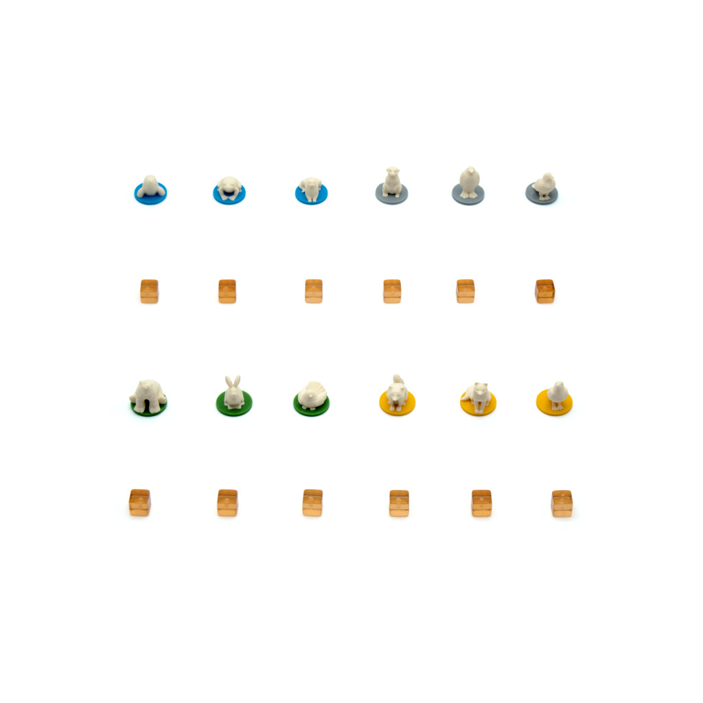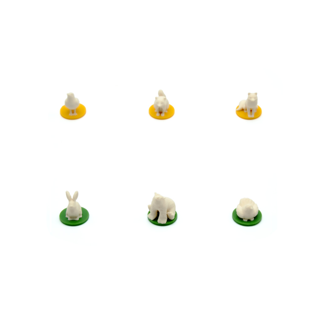 Chaque pion animal représente une espèce différente, montée sur un socle coloré correspondant aux habitats du jeu : bleu, gris, vert, jaune et rouge.